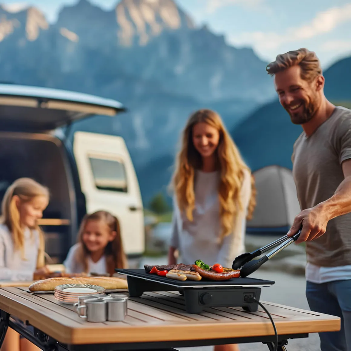 Durch seine raucharme Zubereitung eignet sich der Elektrogrill nicht nur für den Esstisch, sondern auch zum Outdoor-Kochen auf Balkon, Terrasse oder beim Camping-Trip. Sein durchdachtes Design sorgt für maximale Mobilität, sodass er sich überall flexibel einsetzen lässt – auch in Kombination mit hitzebeständigen Gefäßen wie Töpfen und Pfannen. Um die Kochplatte nicht zu beschädigen, empfehlen wir die Verwendung von hitzebeständigen Silikon- oder Holzwerkzeugen.