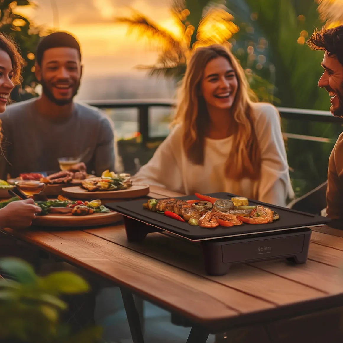 Der MAGIC GRILL von abien revolutioniert das Grillen mit seinem minimalistischen Design, innovativer Heiztechnologie und vielseitigen Einsatzmöglichkeiten. Inspiriert von der japanischen Teppanyaki-Tradition, bringt der High-Tech-Elektrogrill die Kunst des gesunden, schonenden Kochens direkt auf den Tisch – ob in der Küche, im Garten oder beim Camping. Dank seiner flachen, minimalistischen Bauweise und der raucharmen Zubereitung eignet er sich perfekt für gemütliche Mahlzeiten in geselliger Runde.