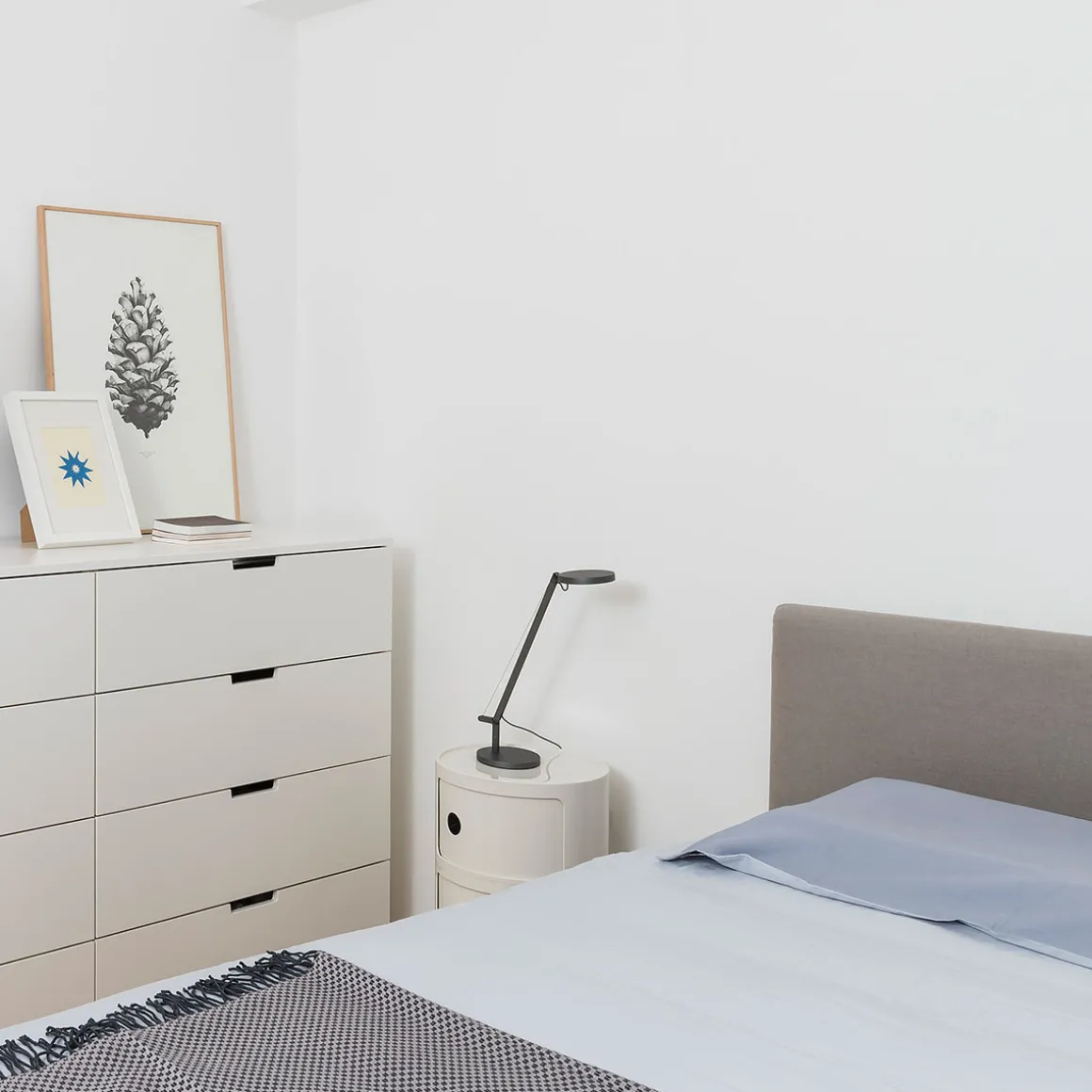 Trotz ihrer geringeren Größe bietet die Demetra Micro die volle Beweglichkeit der klassischen Demetra. Der Leuchtenarm ist um 360° drehbar und um 80° schwenkbar, während der Kopf zusätzlich um 325° dreh- und um 165° schwenkbar ist. So lässt sich das Licht gezielt auf den Arbeitsplatz, einen Beistelltisch oder eine Leseecke ausrichten. Mit dem Tastdimmer am Kopf kann die Lichtintensität individuell angepasst werden – von fokussiertem Arbeitslicht bis zu stimmungsvoller Hintergrundbeleuchtung.