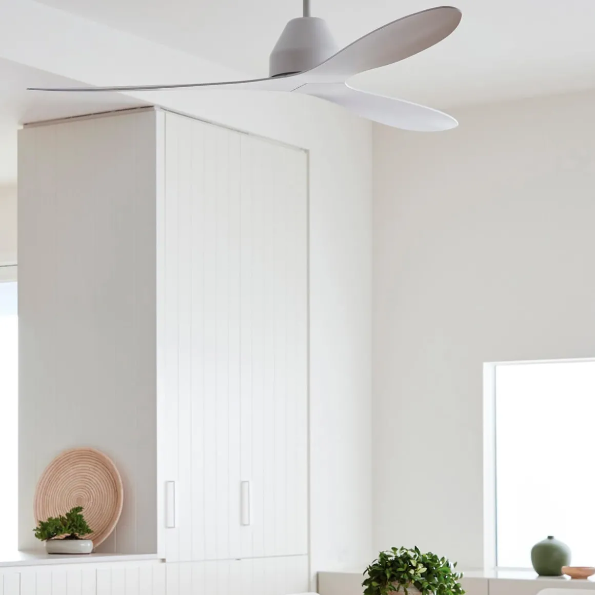 Der moderne Energiespar-Deckenventilator ist mit drei flachen Flügeln ausgestattet, die aus widerstandsfähigem ABS-Kunststoff gefertigt sind und eine effiziente Luftzirkulation gewährleisten. Erhältlich in zeitlosem Weiß und modernem Schwarz, fügt sich der Lucci Air Whitehaven nahtlos in jede Raumgestaltung ein, ohne dabei aufdringlich zu wirken.