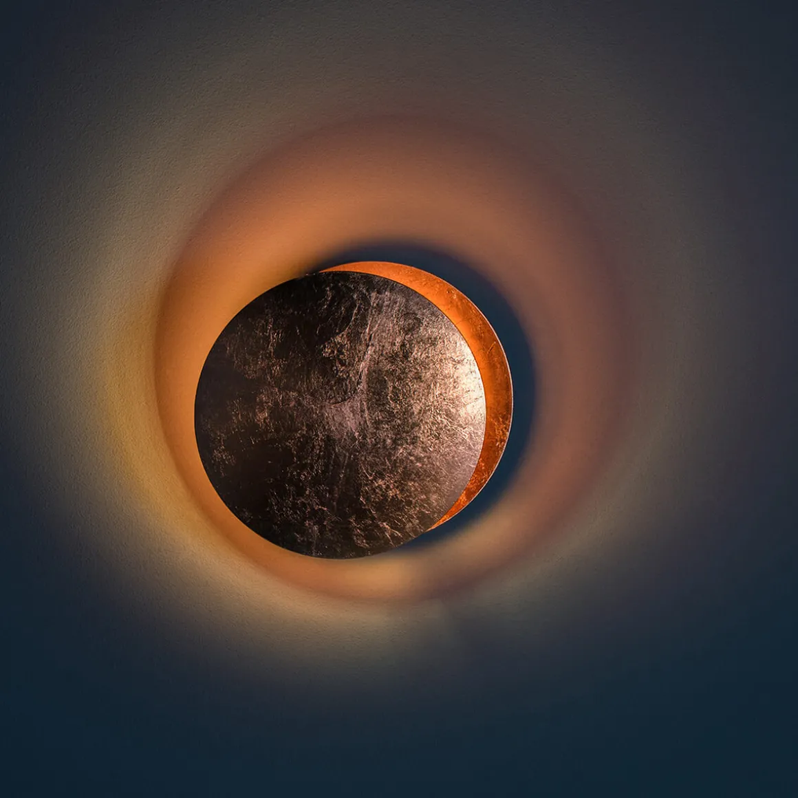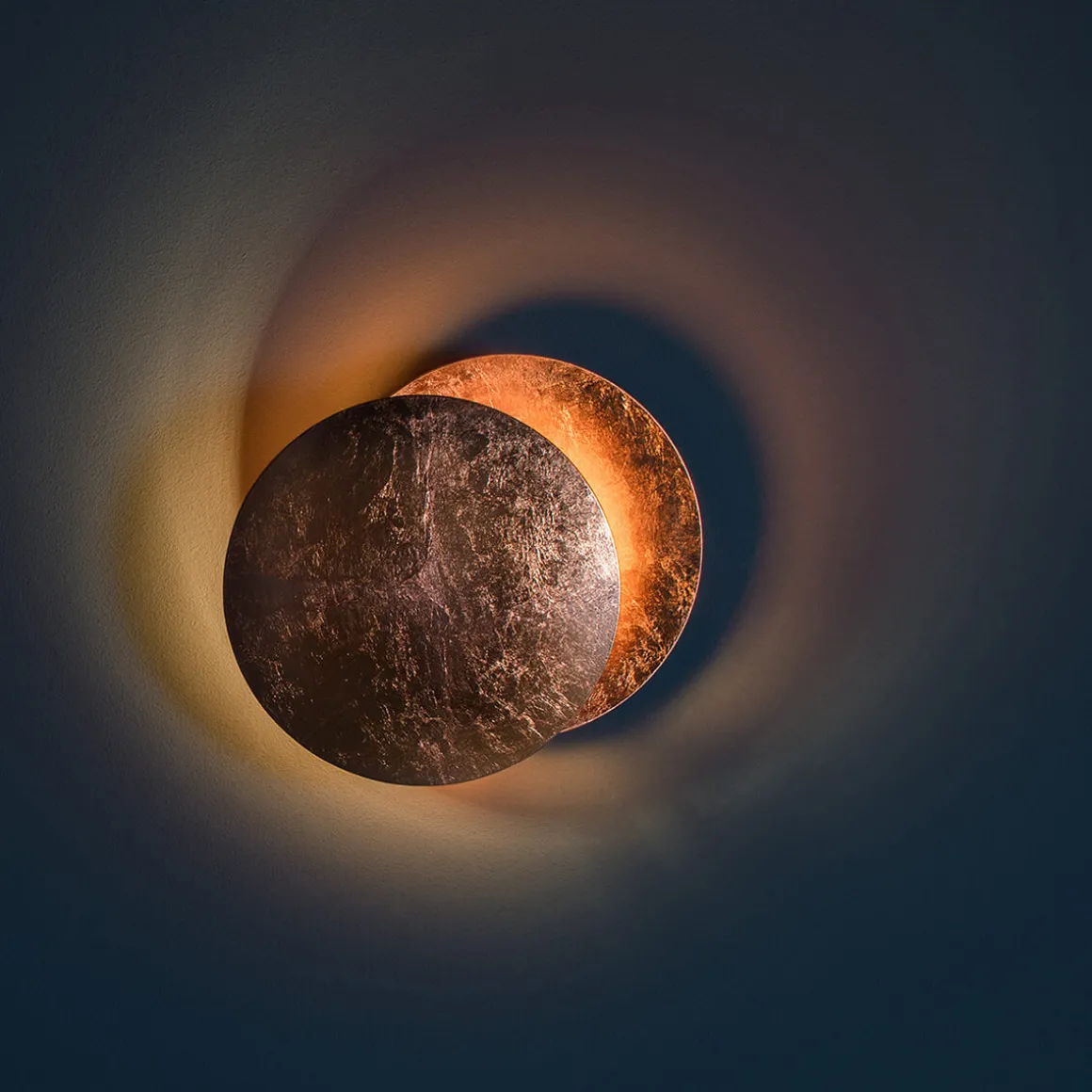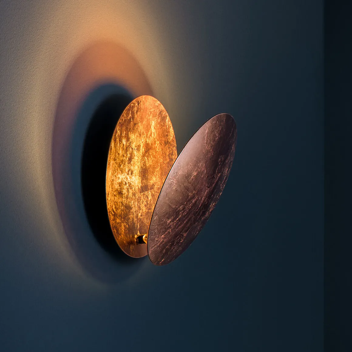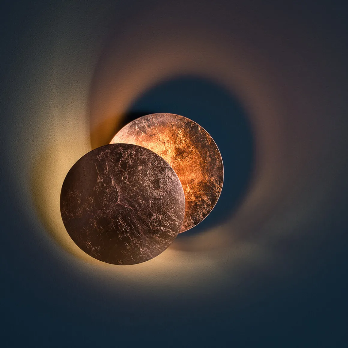 Der Leuchtenkörper besteht aus zwei elegant gewölbten Aluminiumscheiben. Die vordere Scheibe ist schwenkbar und über ein Metallgelenk mit der hinteren Reflektorscheibe verbunden. Durch das Verstellen der vorderen Scheibe können Sie das Schattenspiel und den Lichtwirkungskreis individuell anpassen. Das integrierte LED-Modul sorgt für ein energieeffizientes, warmweißes Licht.