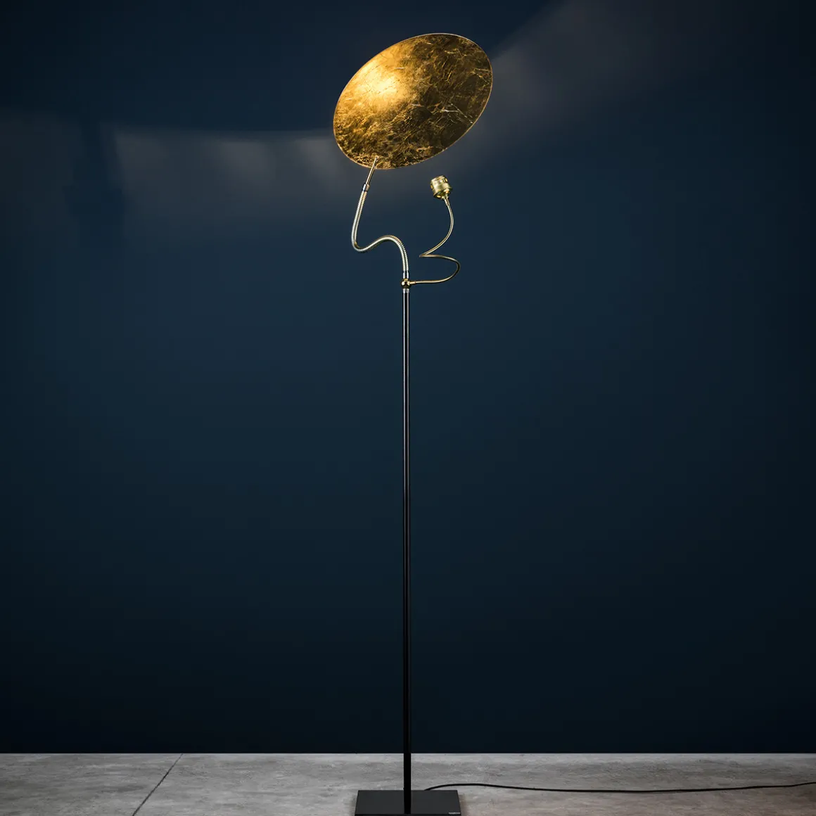 | Material/Oberfläche: | Aluminium mit Blattmetallauflage, Sockel: Roheisen, Flexarm: Nickel / Messing, Kabel: schwarz |