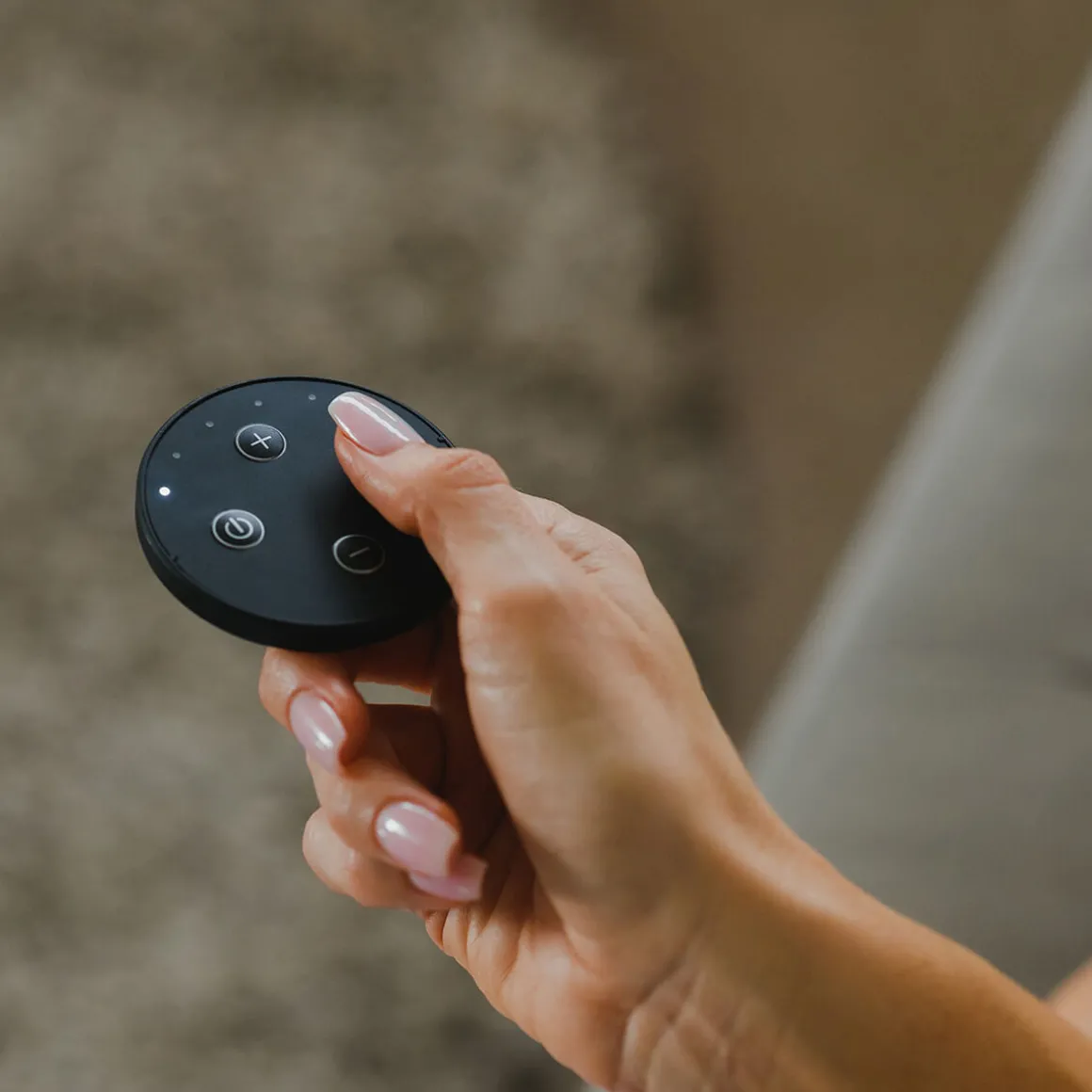 Die Fernbedienung ist magnetisch und kann, wenn der Lüfter nicht in Betrieb ist, am hinteren Schutzgitter des Ventilators mittig platziert werden. Ist der Aura in Gebrauch, können Sie die Fernbedienung einfach in die mitgelieferte Halterung legen, die sich am Rundrohr des Standventilators befestigen lässt.