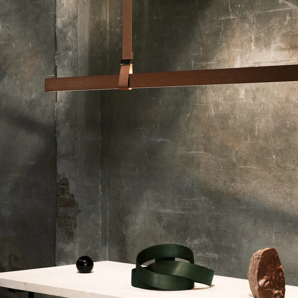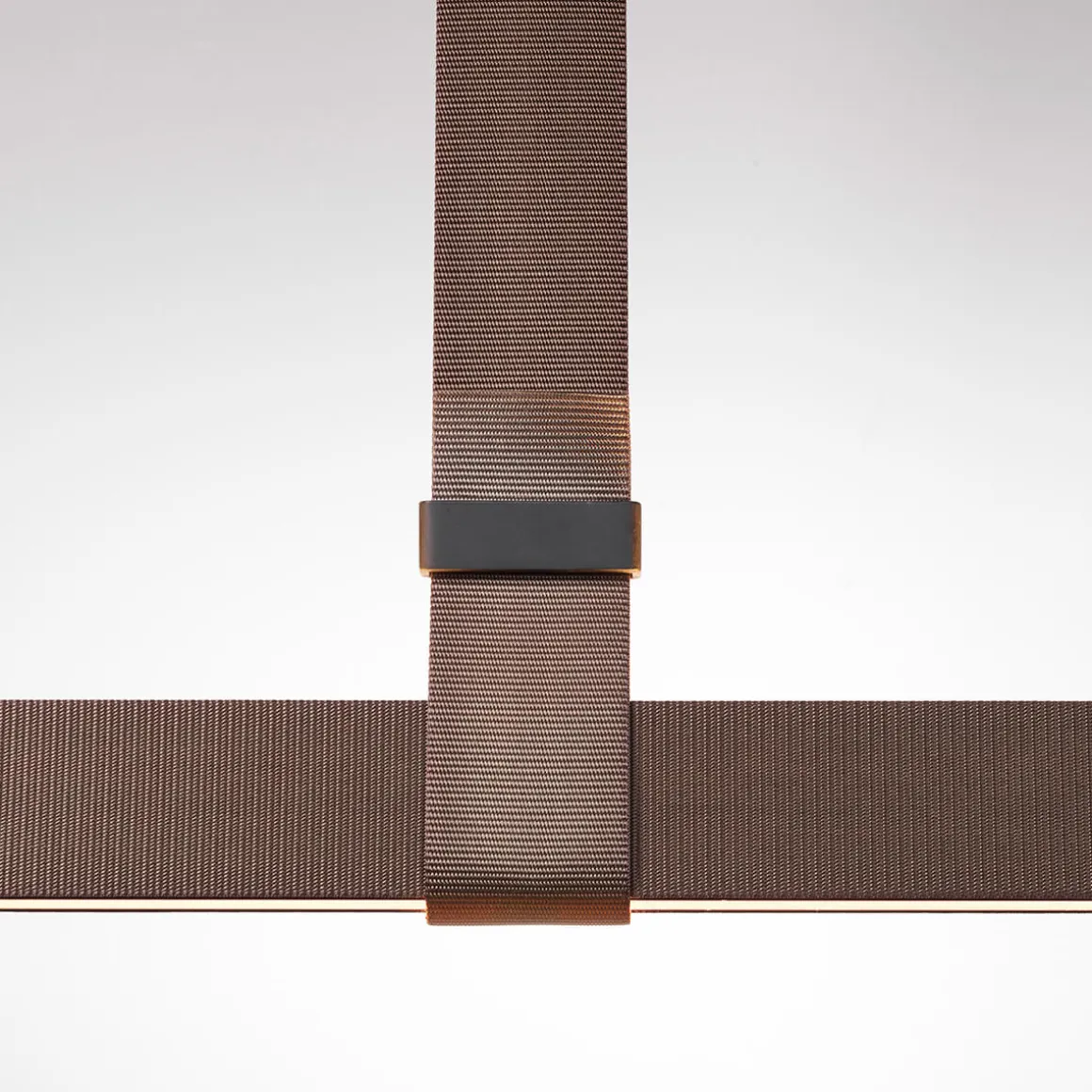 Indem die Gewebebänder durch die Schnallen hindurchgeschoben werden, gestaltet sich die Montage der Pendellampe besonders einfach. Jedes Band kann angepasst werden, um die Beschaffenheit der Umgebung zu berücksichtigen. Durch einen speziellen Mikroanschluss, der in die Klemme des schlanken Beleuchtungsprofils integriert ist, wird die elektrische Verbindung hergestellt.