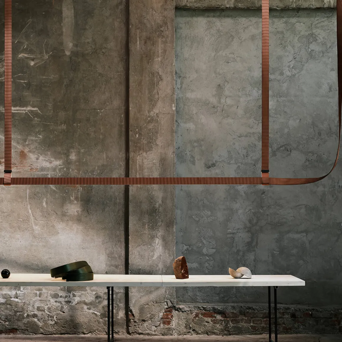 Durch ihre flexible, grafische Form verschönert die Belt Fabric LED Pendelleuchte einen jeden Raum. Ihr geschwungenes Element dient als Verbindung zur Stromquelle, während die starren Teile den Lichtquellen der langen Lichtleitungen entsprechen. Die Metallschnallen, die zugleich als Deckenhalterungen dienen, sind Gürtelschnallen nachempfunden und fügen sich perfekt in das originelle Design.
