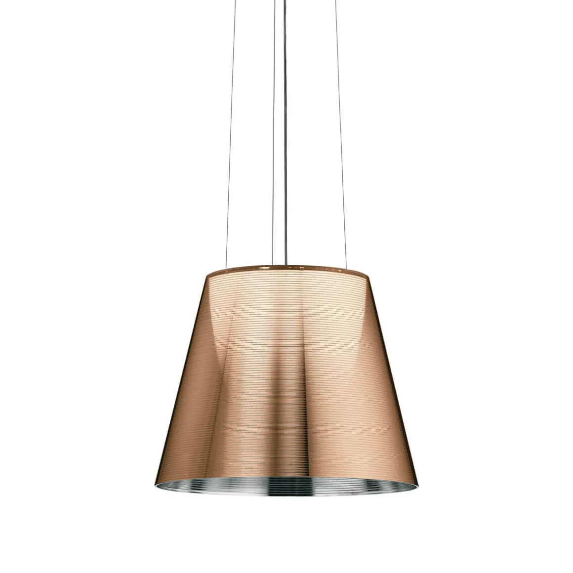 In den Pendellampen der Serie Flos KTribe, von dem französischen Designer Philippe Starck kreiert, verbindet sich eine klassische Formensprache mit moderner Eleganz. Zwei unterschiedliche Diffusoren bilden den Leuchtenkorpus: Der innere ist aus mattweißem Polycarbonat gefertigt und erzeugt ein diffus gestreutes, blendfreies Licht. Der äußere Diffusor reflektiert die Gestalt traditioneller Leuchtenschirme und besteht aus Polymethylmethacrylat (PMMA), das je nach Ausführung transparent gehalten, rauchfarben getönt oder bronzefarben metallisiert ist.