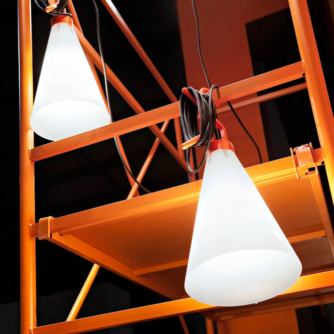 In ihrer Funktionalität erinnert die Flos Mayday an Laternen oder Taschen- und Baustellenlampen. Deren typische Merkmale, ihre Mobilität und die praktischen Aufhängeösen, hat Grcic in ein modernes, zugleich von industriellen Zügen geprägtes Design übersetzt.