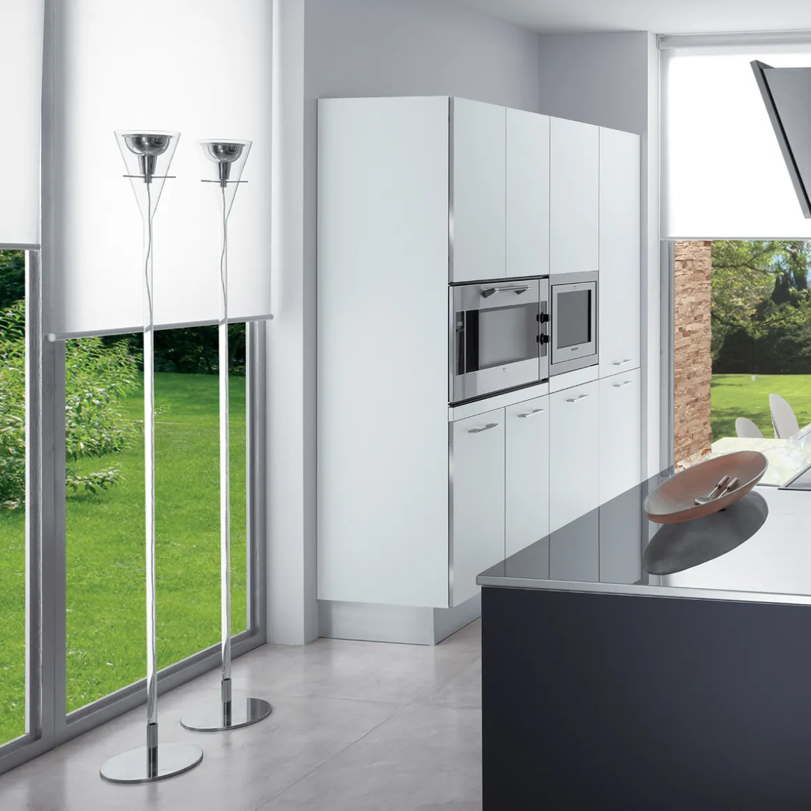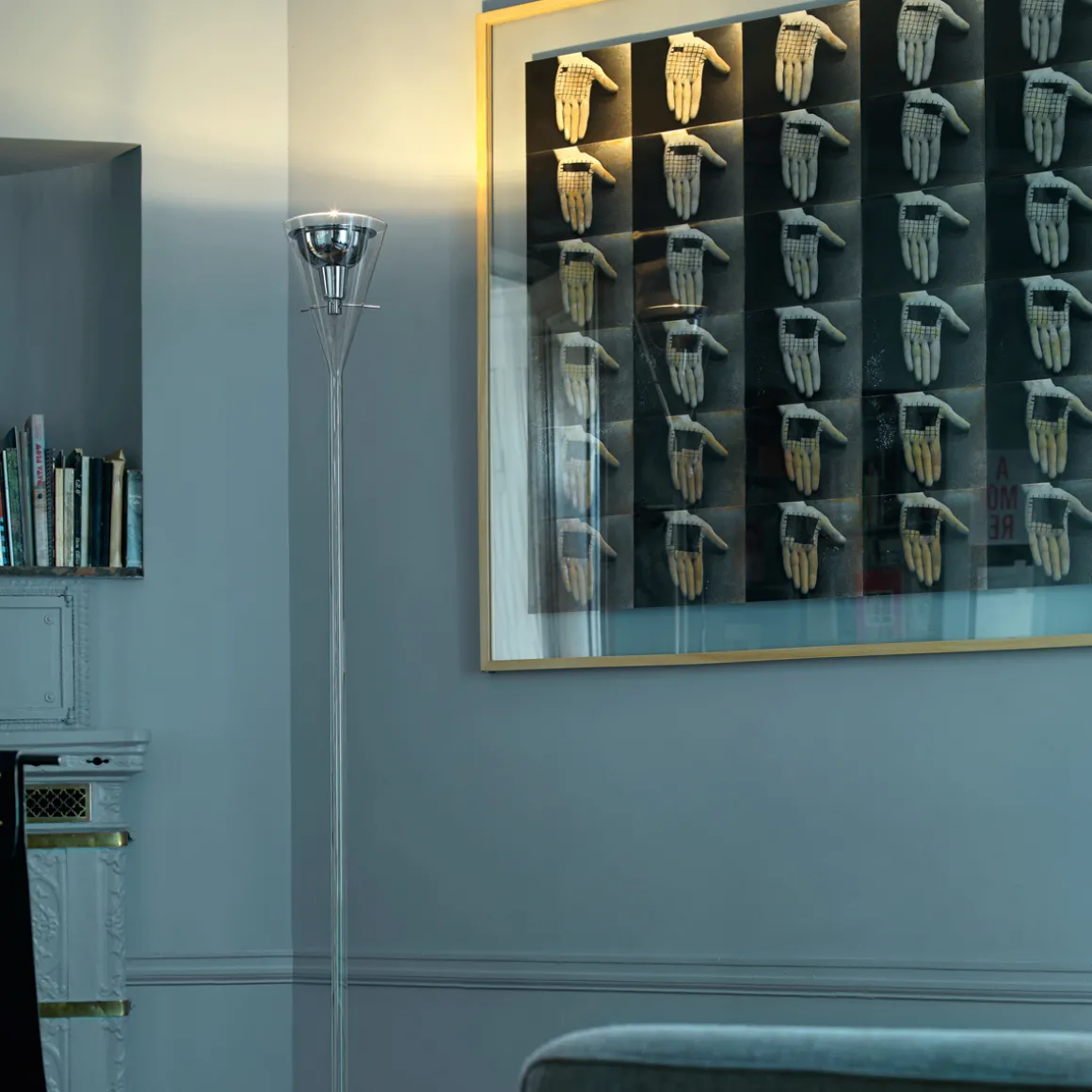 Blickpunkt des Designs ist der kegelförmige, an eine moderne Fackel erinnernde Leuchtenschirm. Er besteht aus hitzebeständigem Borosilikatglas und erwächst dem gläsernen Stiel der Flûte Stehleuchte in einer einzigen fließenden Form. Das transparente Glas gibt den Blick frei auf das transparente Netzkabel und den Reflektor aus verchromtem Aluminium.