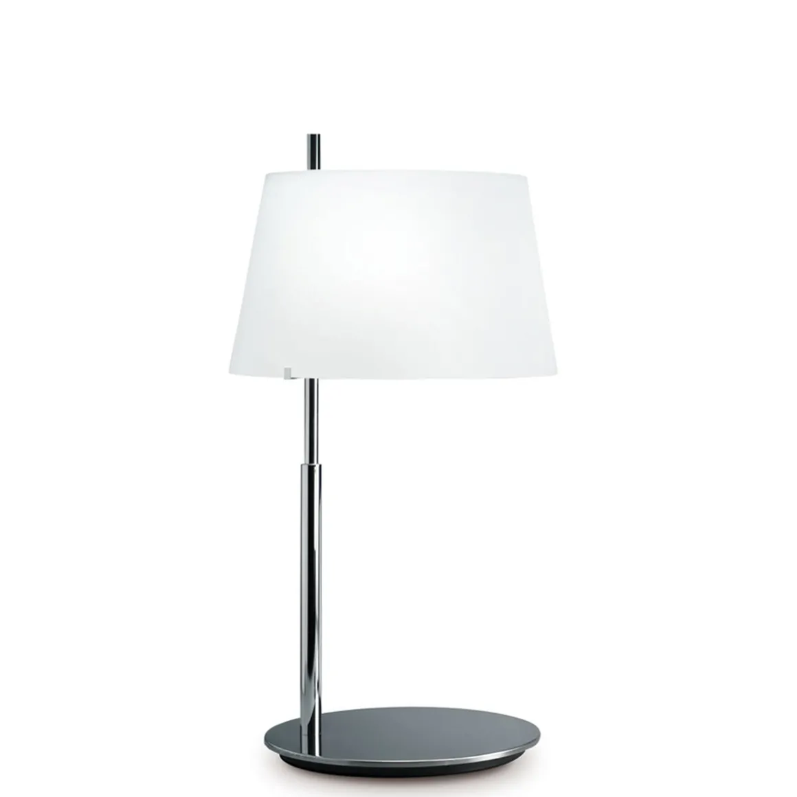 Bei der Fontana Arte Passion trifft der Glanz von Metall auf die softe Oberfläche mundgeblasenen Opalglases. Charakteristisch für das Design der Tischlampe ist der dezentral angeordnete Leuchtenstab, der aus verchromtem Messing besteht. Ihm aufgesetzt ist der gläserne Lampenschirm, dessen satinierte Oberfläche das Licht diffus in den Raum abgibt.