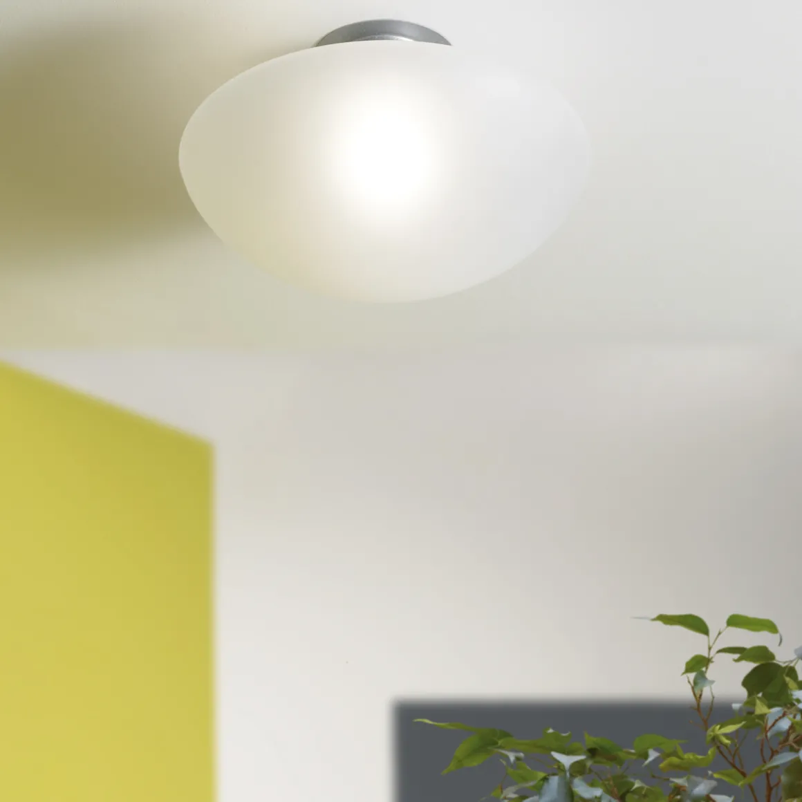 Eine harmonische Linie und diskrete Gestaltung bestimmen den Leuchtenkorpus der Sillabone. Die größere Version der Fontana Arte Sillaba Leuchtenfamilie eignet sich zur Installation als Wand- oder Deckenleuchte und gliedert sich ihrer Umgebung harmonisch ein. Für ein angenehm helles, rundum diffus gestreutes Licht sorgt der sanft geschwungene Schirm aus sandgestrahltem, weißem Glas.