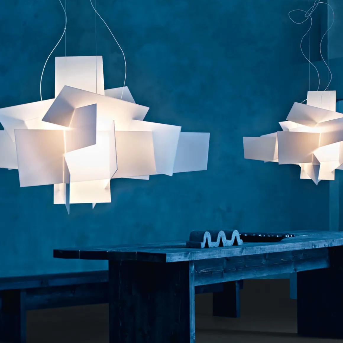 Während die technologische Ausstattung aktualisiert wurde, orientierte man sich bei der formalen Konzeption an der originellen Geometrie der Pendellampe. Wie bei dieser wurde der Leuchtenkorpus der Big Bang LED Sospensione aus scheinbar zufällig kombinierten und sich unregelmäßig überschneidenden Scheiben geschaffen, die aus unterschiedlichen Blickwinkeln stets neuartige Kompositionen bieten.