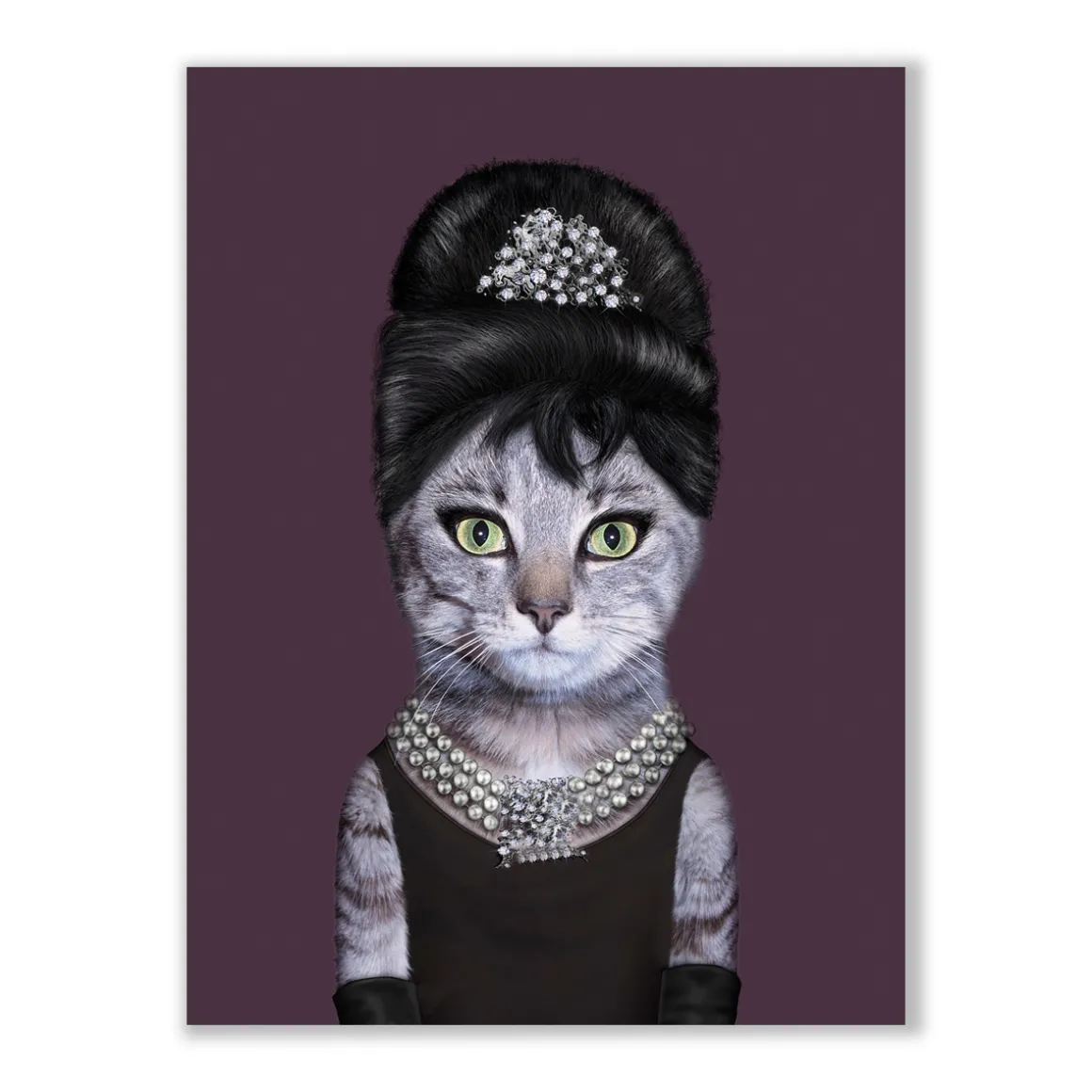 - Die abgebildete Katze ist als Audrey Hepburn in einer ihrer Paraderollen kostümiert