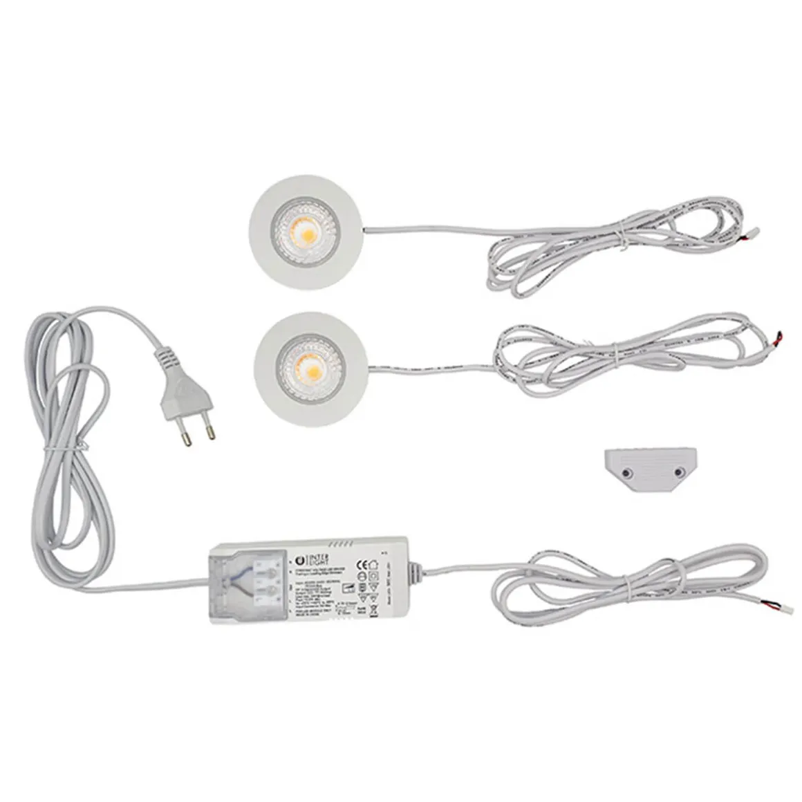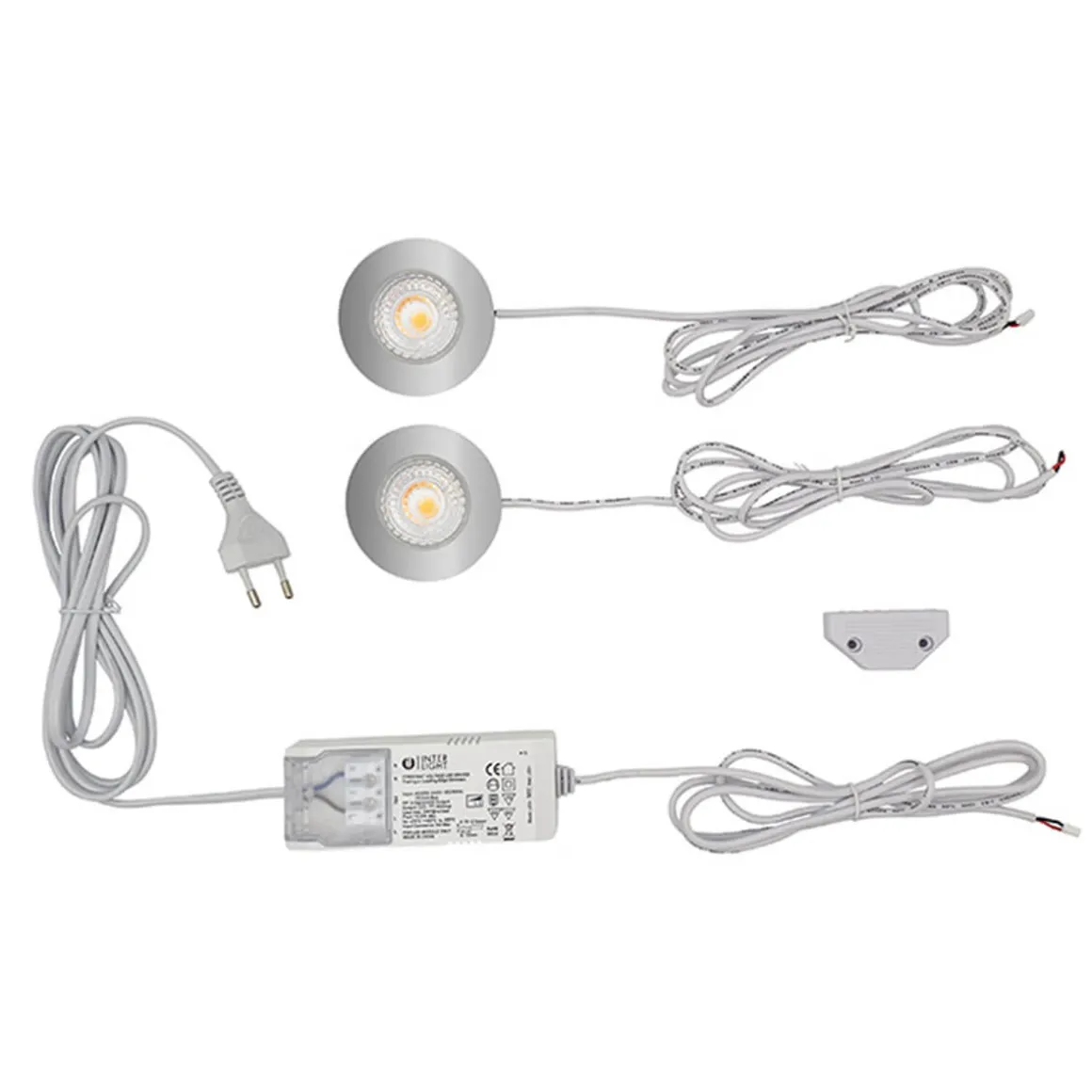 Das 2er Set der Interlight Cabiled Downlights umfasst zwei Möbeleinbaustrahler mit 1,5 m langem Kabel und einen Treiber mit 2 m langem Stromkabel bzw. 1,5 m langem Kabel mit Stecker. An einen einzigen Treiber lassen sich bis zu vier Leuchten anschließen. Wünschen Sie mehr als nur zwei Downlights, können Sie weitere Spots in unserem Shop erwerben.