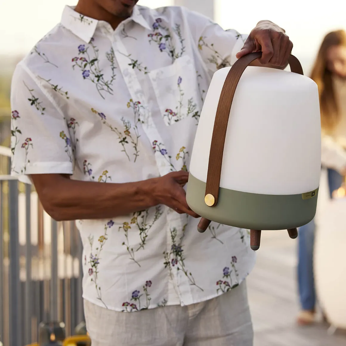 Das Design der schönen Musiklampe verknüpft nordische Eleganz mit zeitgemäßen, soften Farbnuancen. Auf diese Weise eignet sich die Lite-up Play 2.0 von Kooduu für diverse Einrichtungskonzepte. Die Farbpalette umfasst erdiges Braun, mattes Grün, dunkles Blau und einen hellen Sandton. Details wie der Messingknopf und der elegant gebogene Henkel aus Holz tragen ihr Übriges zur zeitgemäßen Designsprache bei.