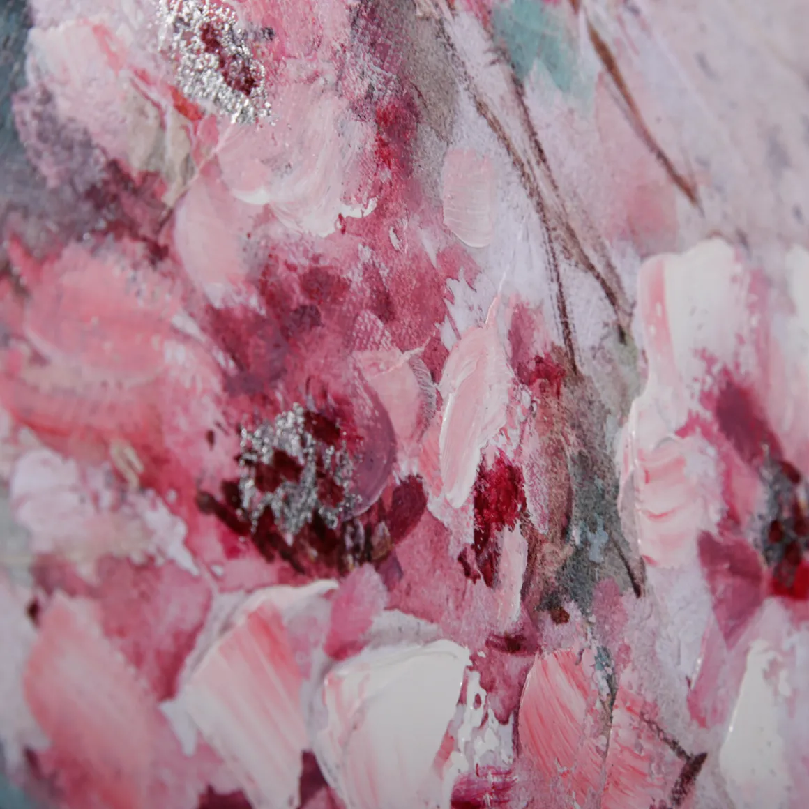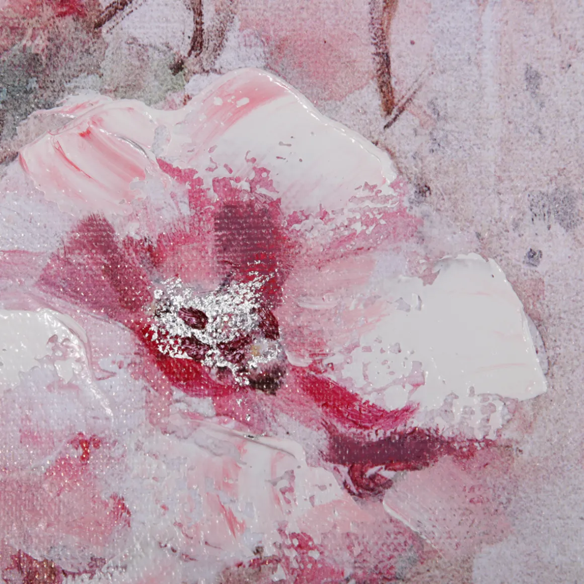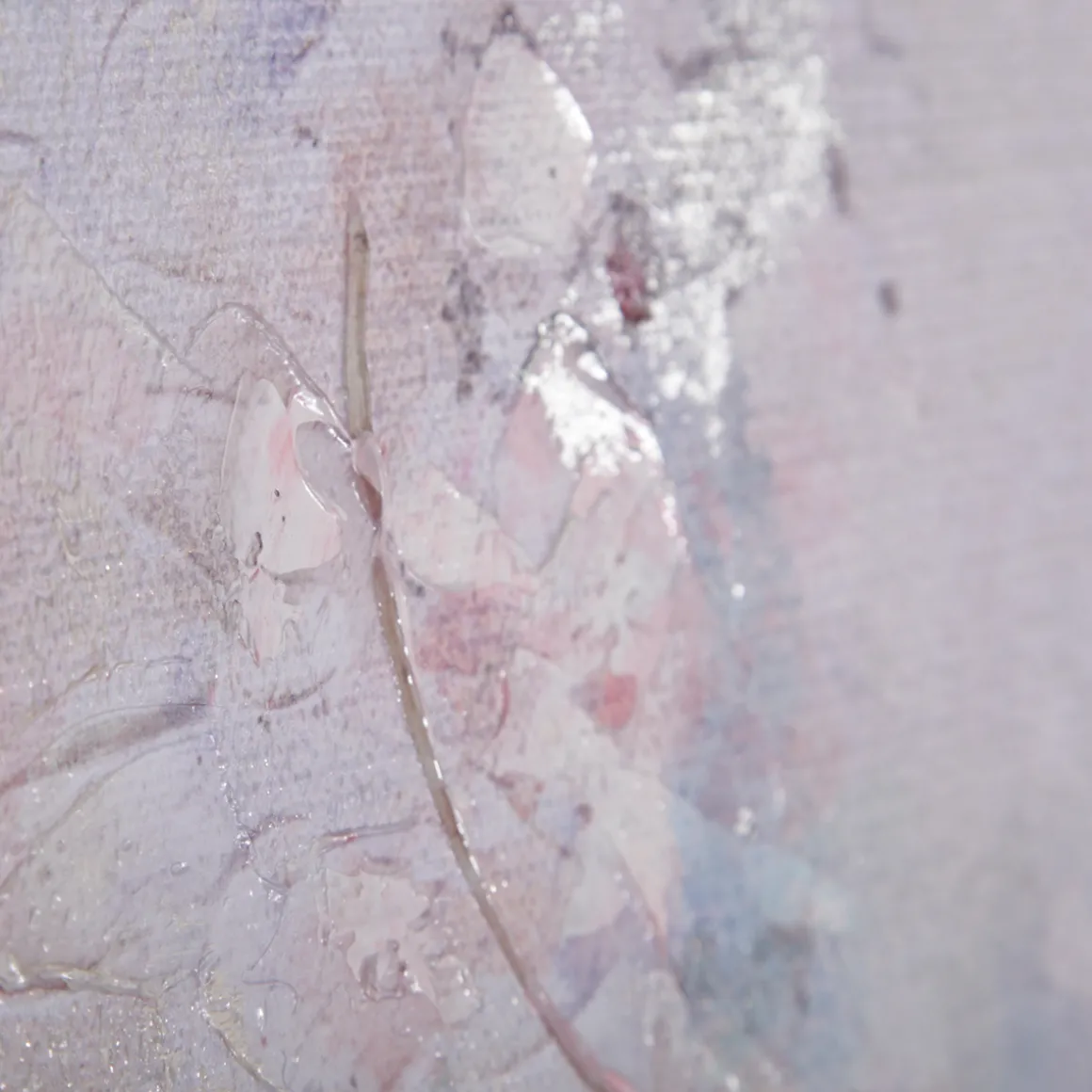 Besonderen Glanz erhält das Bild durch gezielt gesetzte Highlights mit silbern glänzender Farbe. Diese harmonieren aufs Schönste mit der übrigen Farbpalette: den sanften Rosatönen und dem intensiven Pink. Unterbrochen werden diese von pastos aufgetragenen Akzenten in Weiß und aquarelliert anmutenden Flächen in Blassgrün.