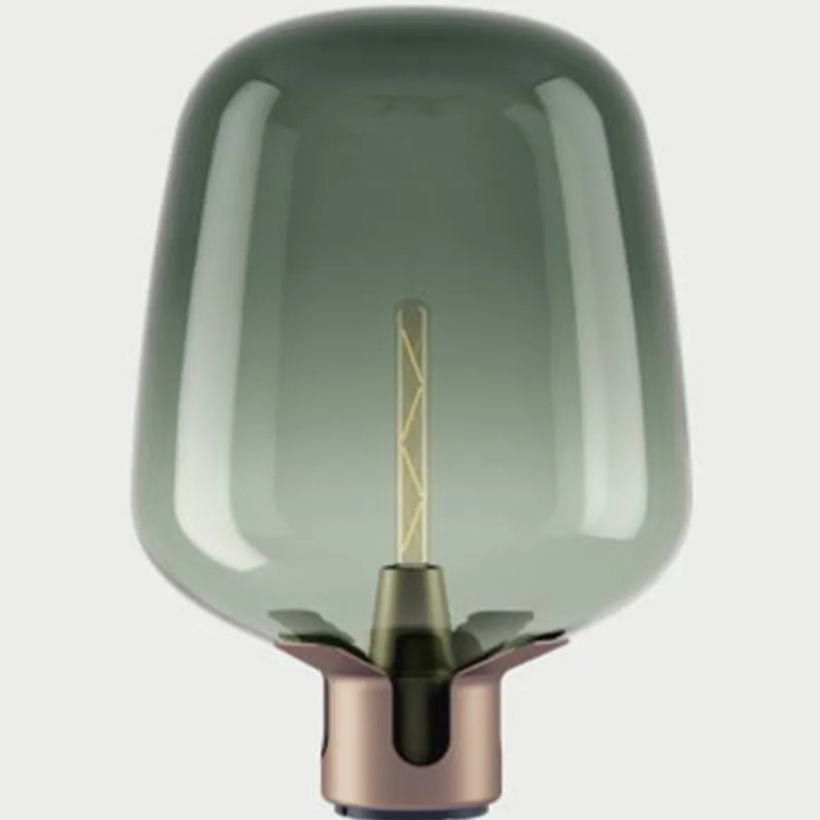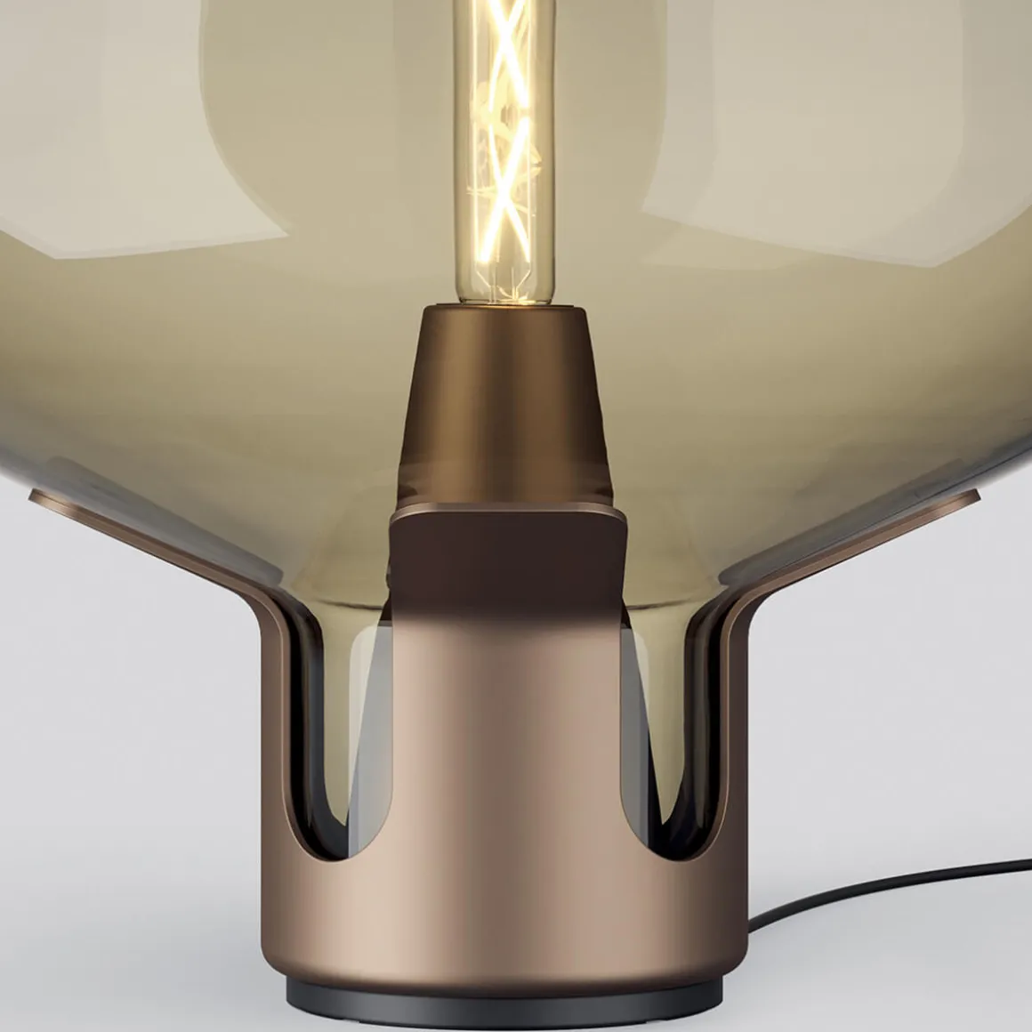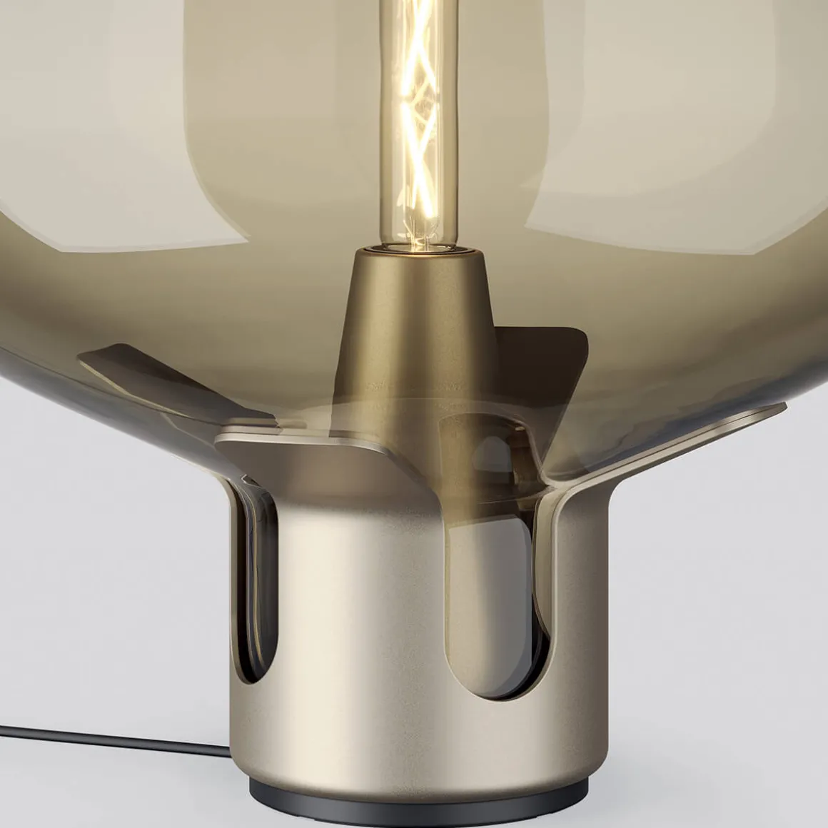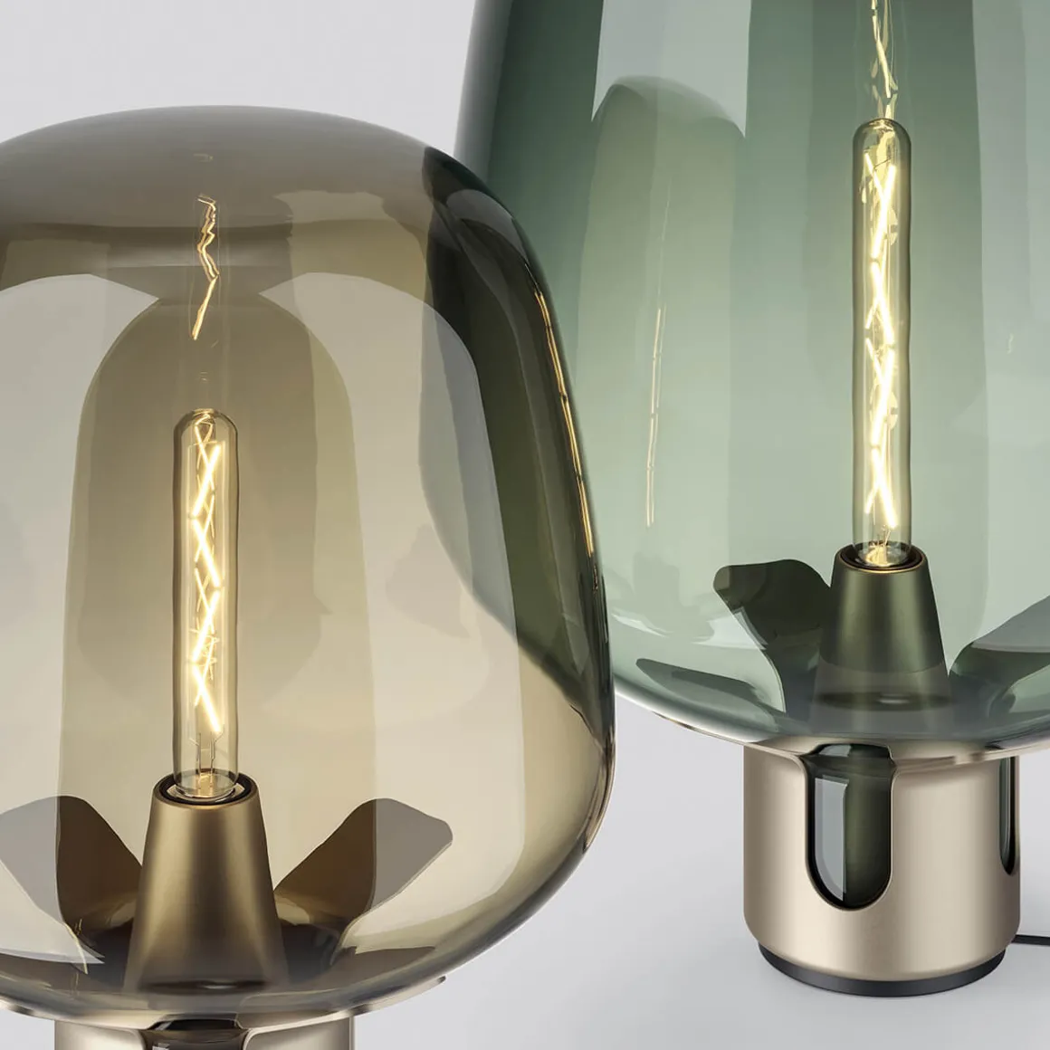 Die Flar Large Tischleuchte von Lodes beeindruckt durch ihre elegante und zugleiche schlichte Ästhetik. Die , die als Tisch- oder Bodenleuchte verwendet werden kann, erinnert an eine traditionelle Sturmlaterne, die zum Schutz der Flamme mit einem Glas gesichert ist. Der lasergeschnittene Sockel in Champagner oder Braun erscheint wie eine geöffnete Blüte und bildet einen reizvollen Kontrast zum mundgeblasenen Schirm in honigfarbener bzw. türkiser Tönung.
