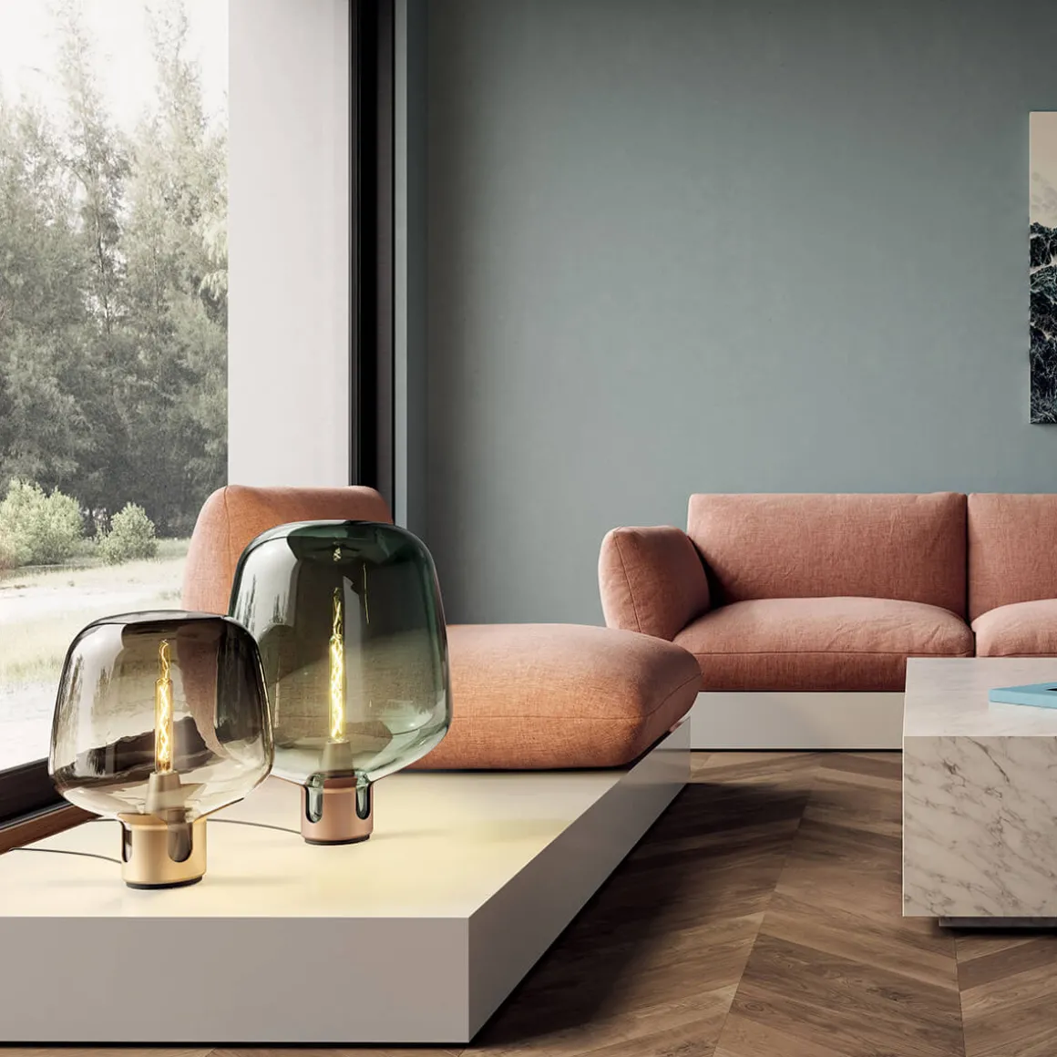 Zur Bestückung empfehlen sich röhrenförmige LED-Filamentlampen mit warmweißer Lichtfarbe, die den industriellen Look der unterstreichen und ein heimeliges Licht erzeugen. Durch die honigfarbene bzw. türkise Tönung des mundgeblasenen Glasschirms wird das Licht gefiltert und sanft in den umliegenden Raum gestreut.
