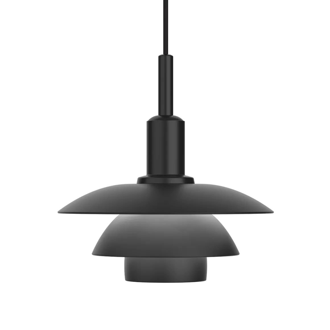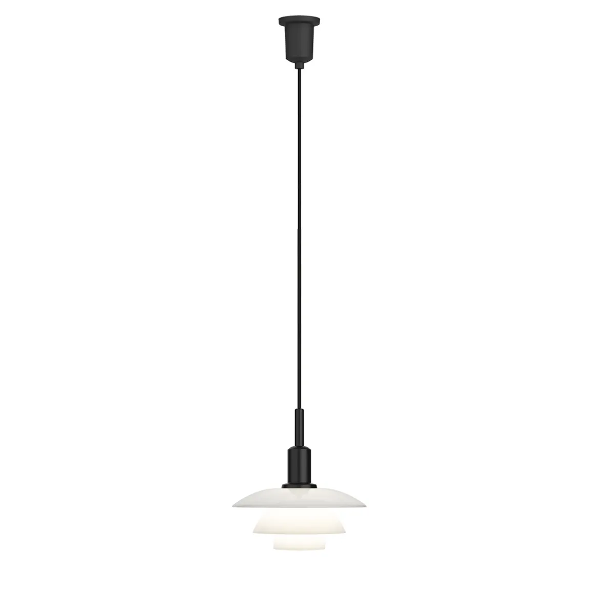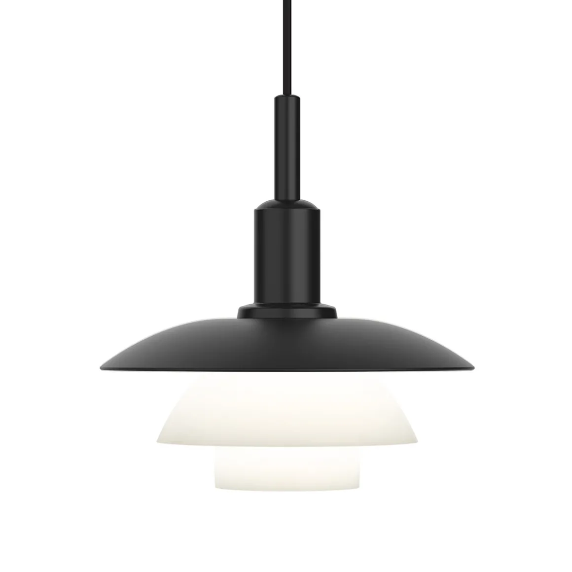 Durch ihr charakteristisches reflektierendes Dreischirmsystem erzeugt die PH 3/3 ein diffuses, angenehmes Raumlicht. Erhältlich ist sie mit Schirmen aus mundgeblasenem Opalglas oder aus mattschwarz lackiertem Metall mit Soft-Touch-Finish. Die lichtdurchlässigen Glasschirme erzeugen einen weichen, diffusen Schimmer, während die Metallschirme das Licht stärker nach unten lenken. Bei der Kombination aus Metalloberschirm und Opalglasschirmen strahlt das Licht sowohl nach unten als auch zur Seite hin. Ein mitgelieferter mattierter Glasdiffusor kann der Hängelampe nachträglich eingesetzt werden, um eine noch sanftere Lichtwirkung zu erzielen.