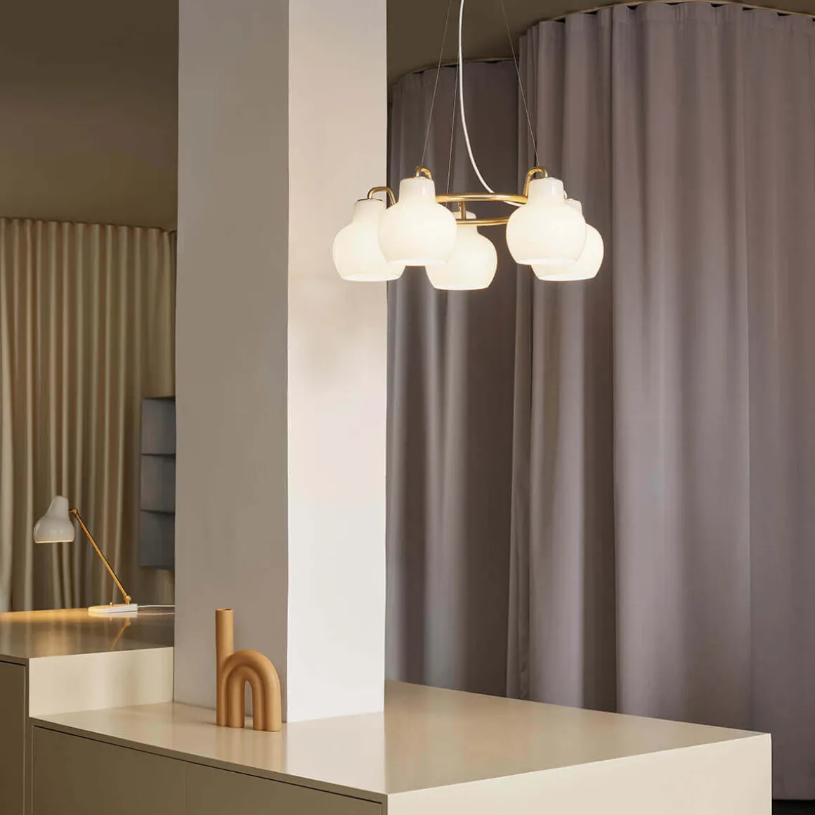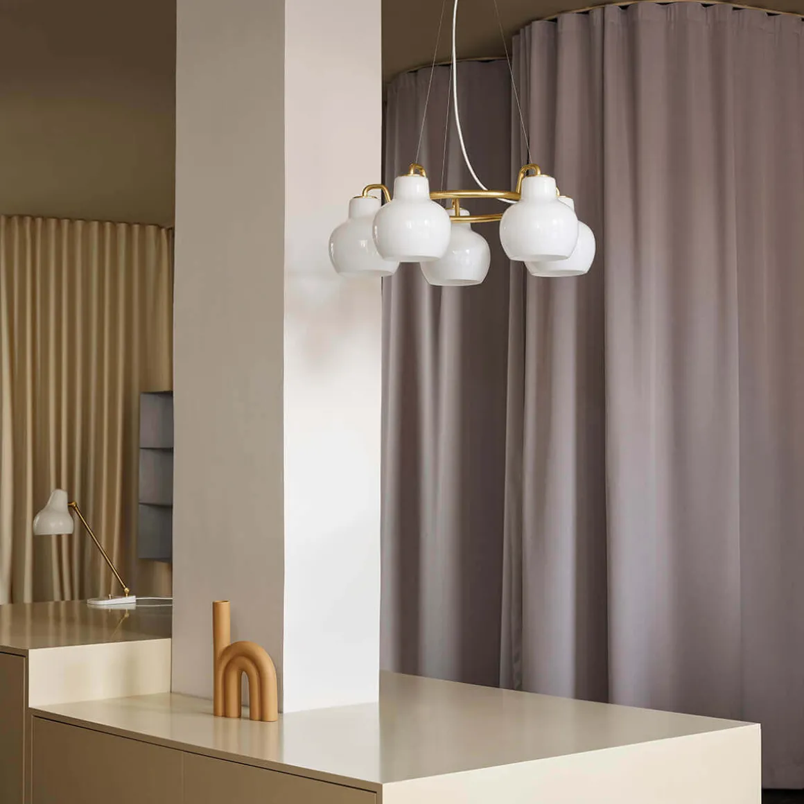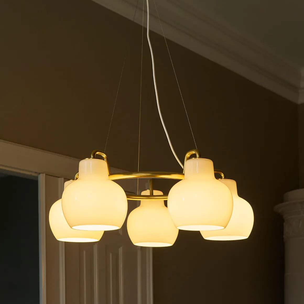 Die VL Ring Crown ist in Ausführungen mit drei, fünf oder sieben Schirmen erhältlich, die aus mundgeblasenem, dreischichtigem Opalglas gefertigt sind. Das hochwertige Glas sorgt für eine sanfte, diffuse und hüllt den Raum in eine warme, einladende Atmosphäre. Der Großteil des Lichts wird direkt nach unten abgegeben, wodurch die Pendellampe perfekt für Esstische, Wohnbereiche oder repräsentative Einrichtungskonzepte geeignet ist.