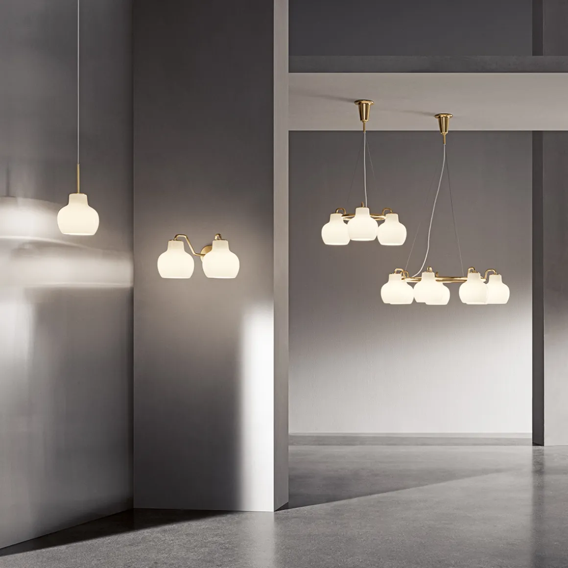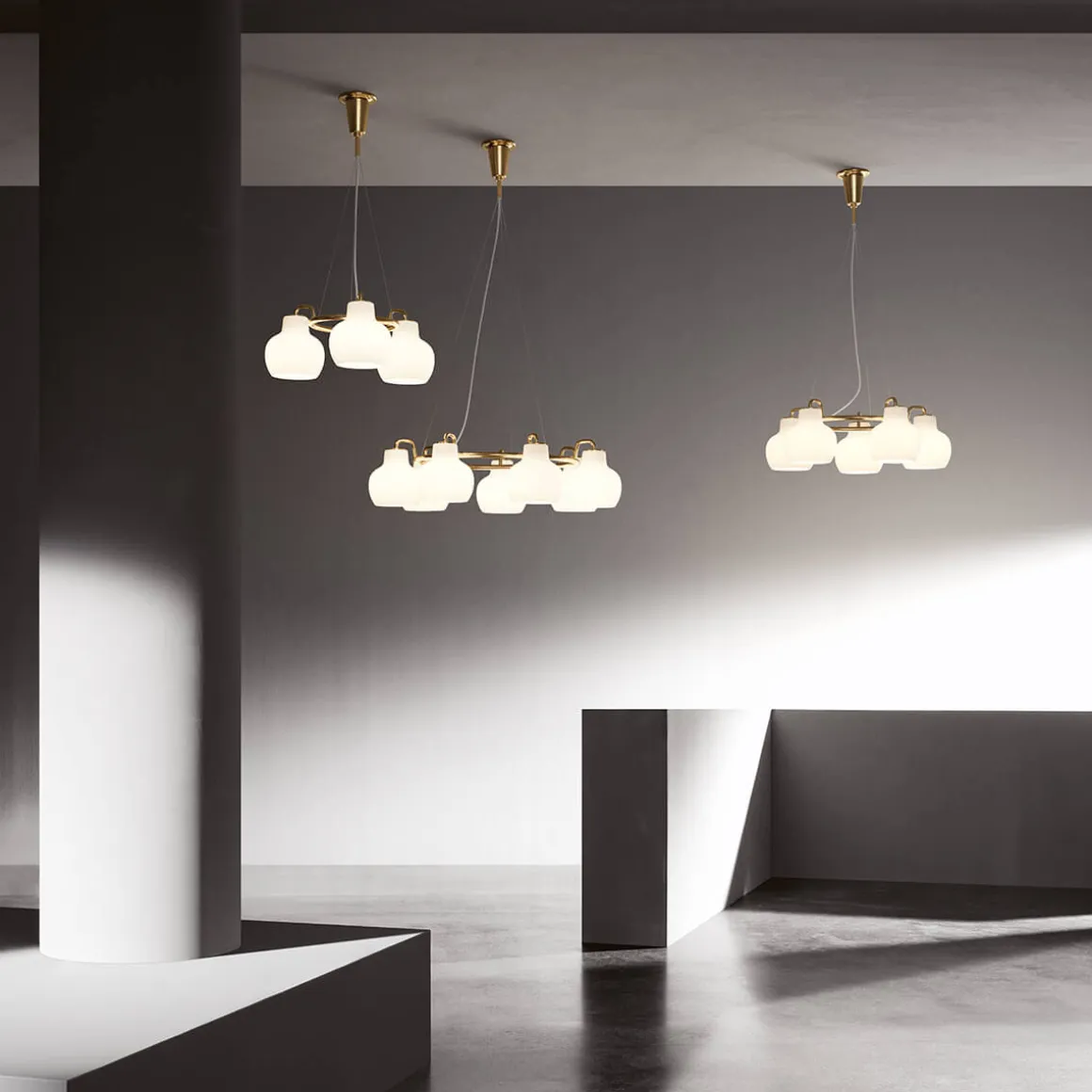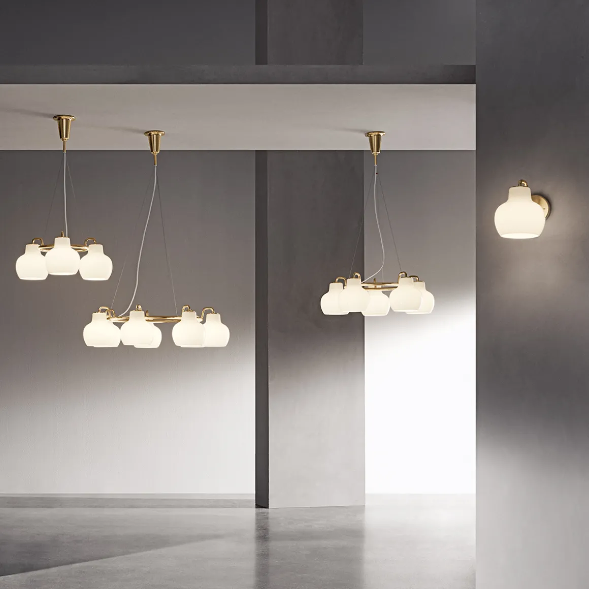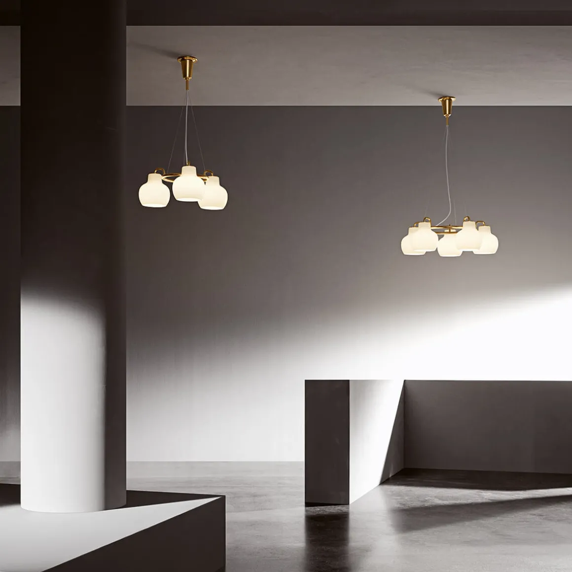 Die VL Ring Crown ist in Ausführungen mit drei, fünf oder sieben Schirmen erhältlich, die aus mundgeblasenem, dreischichtigem Opalglas gefertigt sind. Das hochwertige Glas sorgt für eine sanfte, diffuse und hüllt den Raum in eine warme, einladende Atmosphäre. Der Großteil des Lichts wird direkt nach unten abgegeben, wodurch die Pendellampe perfekt für Esstische, Wohnbereiche oder repräsentative Einrichtungskonzepte geeignet ist.