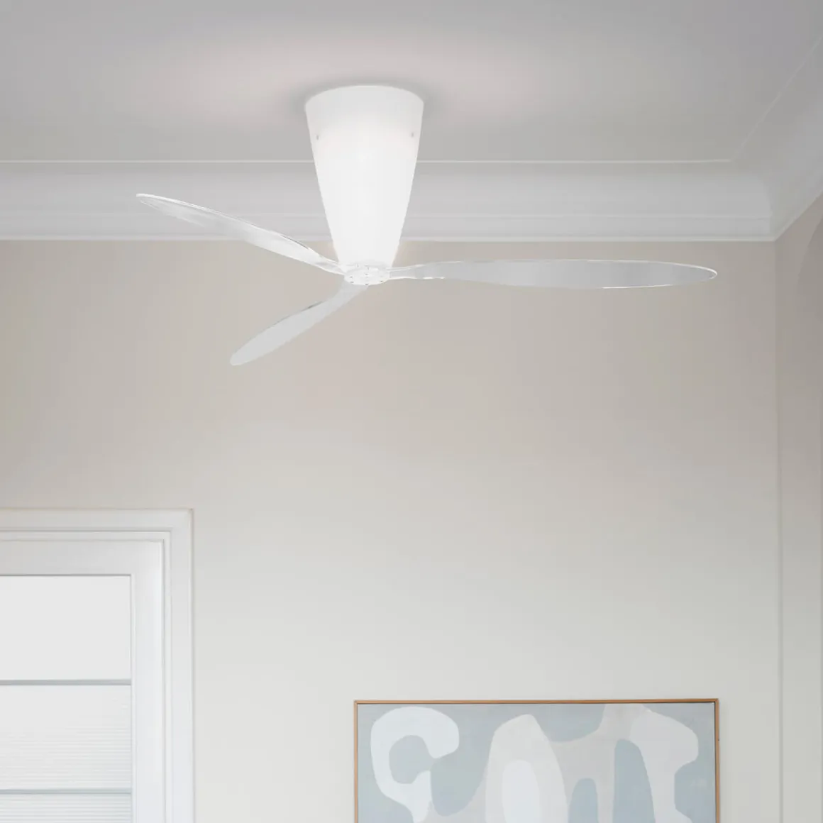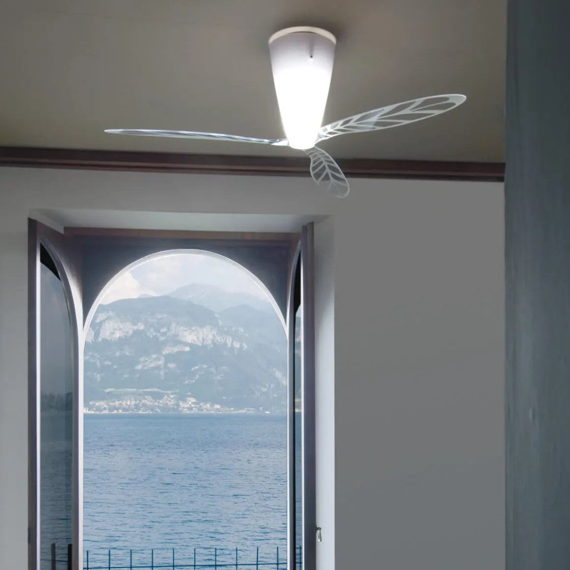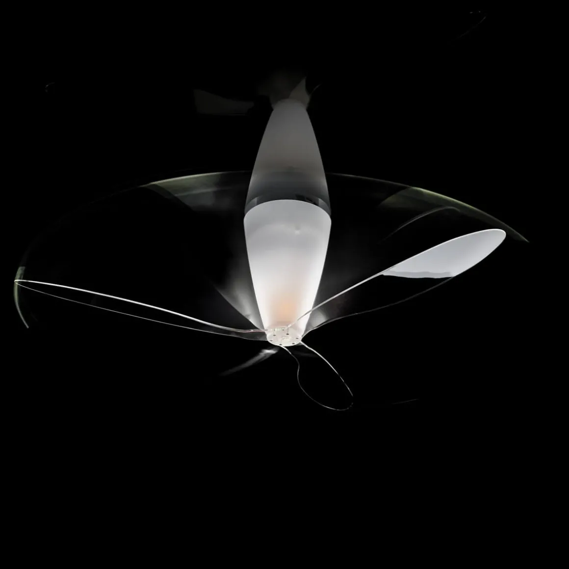 Im Zentrum des Designs steht ein opalweißer Leuchtkörper, der für eine gleichmäßige, angenehm diffuse Lichtausstrahlung sorgt – ideal für Wohnzimmer, Schlafzimmer oder stilvolle Lounges. Unterhalb des Leuchtkörpers sind Flügel aus durchscheinendem Methacrylat angebracht, die sich auf Knopfdruck in Bewegung setzen. Der integrierte, flüsterleise Motor (nur 32 dB) sorgt für eine dezente Luftzirkulation – nahezu geräuschlos und ohne störende Luftwirbel. Die Beleuchtung bleibt dabei jederzeit ungetrübt.