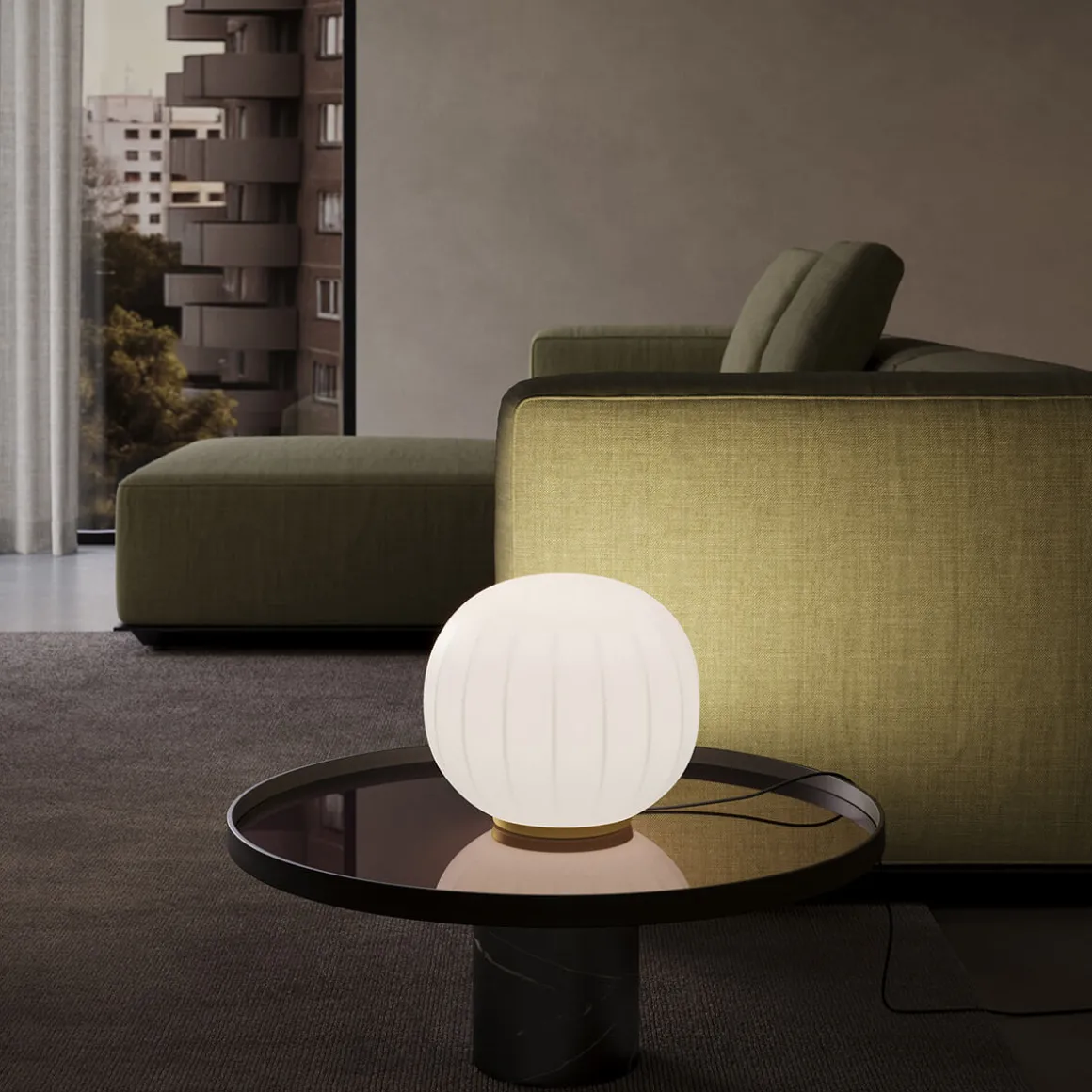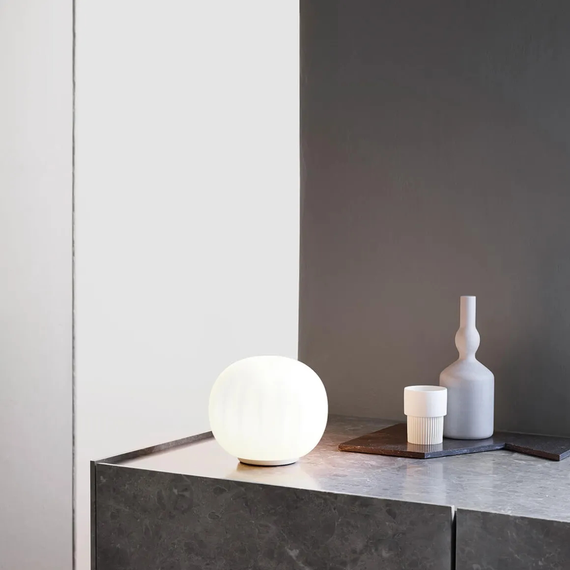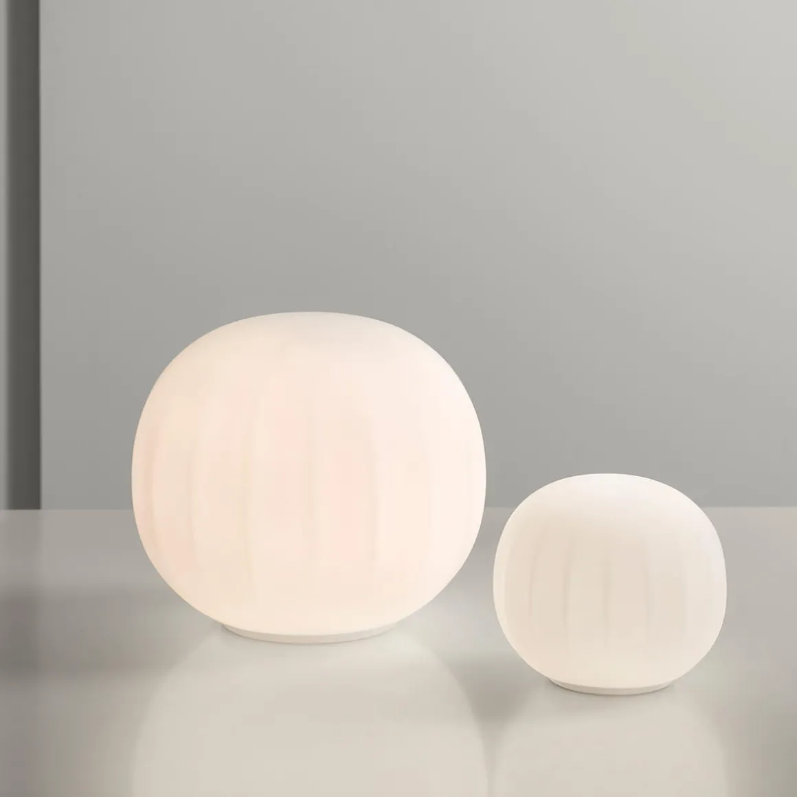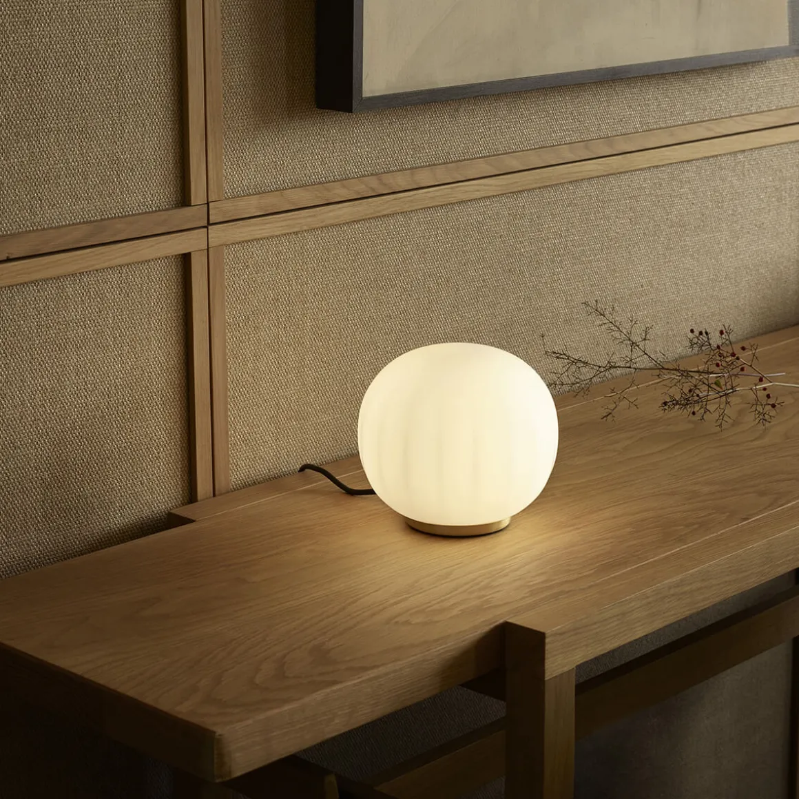 Ihr mundgeblasener Opalglasschirm mit sanft gerippter Oberfläche verleiht der eine feine Textur, die nicht nur visuell, sondern auch haptisch überzeugt. Das diffus gestreute Licht sorgt für eine gleichmäßige, blendfreie Ausleuchtung und unterstreicht die ruhige Ausstrahlung der Lita. So entsteht ein harmonisches Lichtspiel, das Räume dezent und dennoch wirkungsvoll inszeniert.