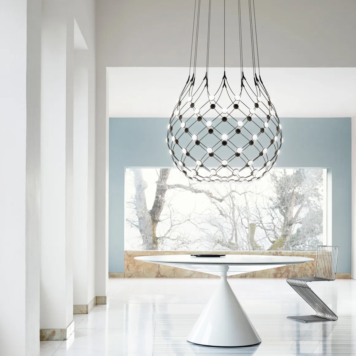 Die Mesh Sospensione von Luceplan, entworfen von Francisco Gomez Paz, vereint ein eindrucksvolles Design mit modernster Lichttechnologie. Ihre nahezu transparente Struktur, bestehend aus einem filigranen Netz flexibler Kabel, wird von LED-Quellen an den Kreuzungspunkten durchzogen und erzeugt eine faszinierende Lichtwirkung, die jeden Raum in Szene setzt.