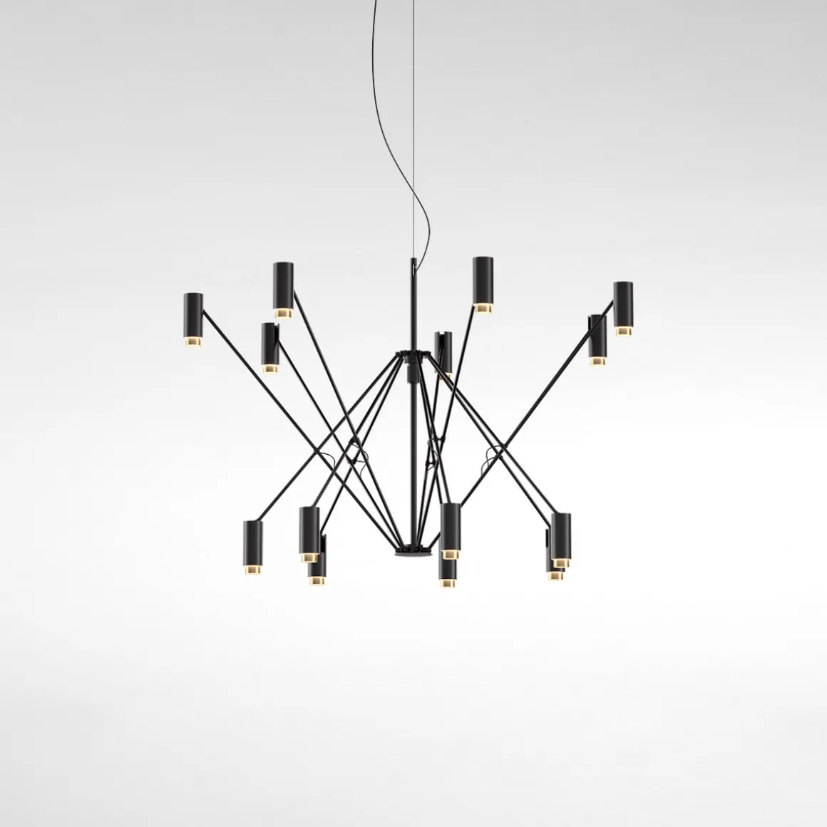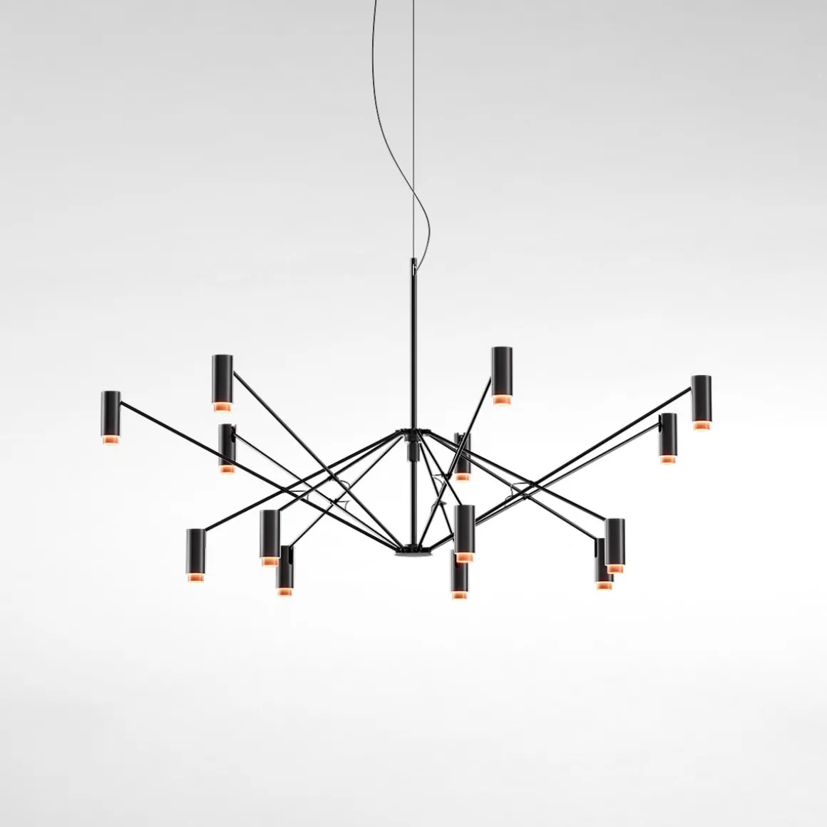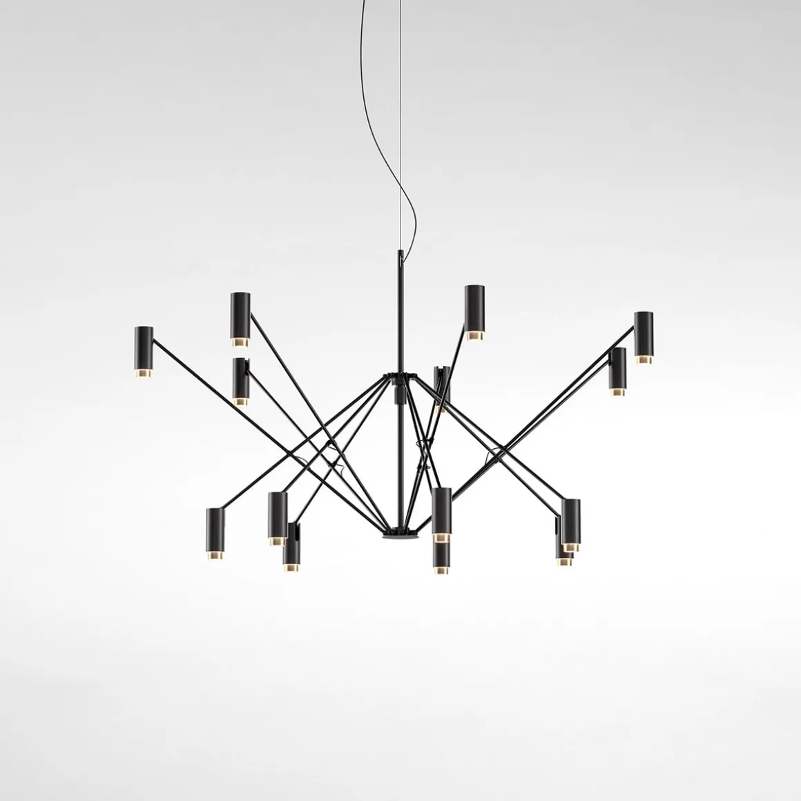 Die gleichmäßige, nach unten gerichtete verdankt sich den zylindrischen Strahlern, die an den Endpunkten der schwarzen Streben angeordnet sind und die LED- tragen. Als dekoratives Detail sind sie mit Innenringen in den Farben Gold, Elfenbein und Terrakotta versehen, die, wenn die Pendelleuchte eingeschaltet ist, das Licht reflektieren.