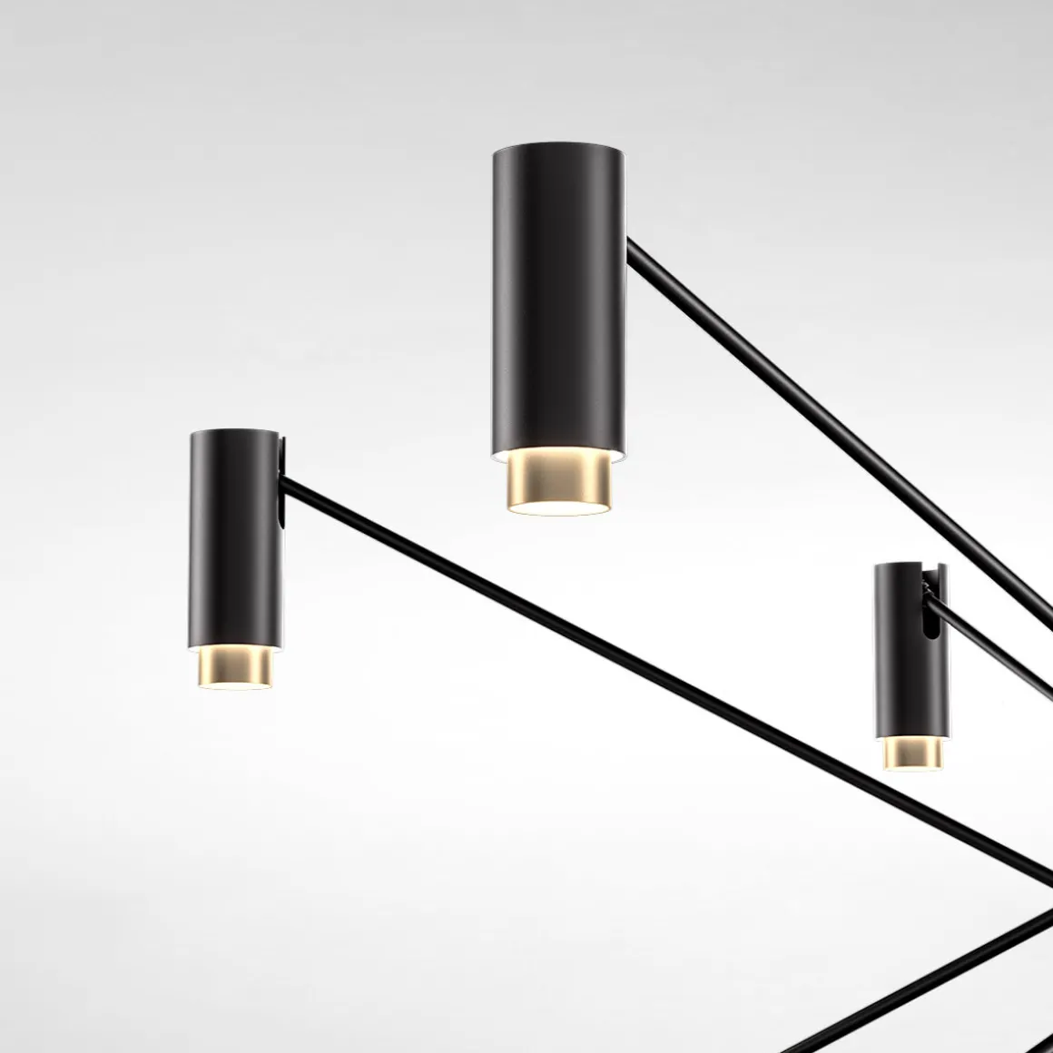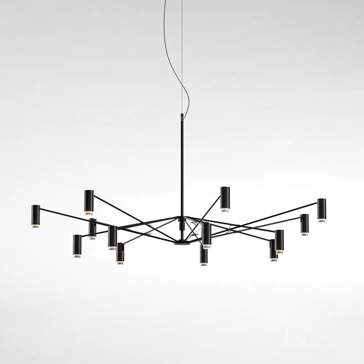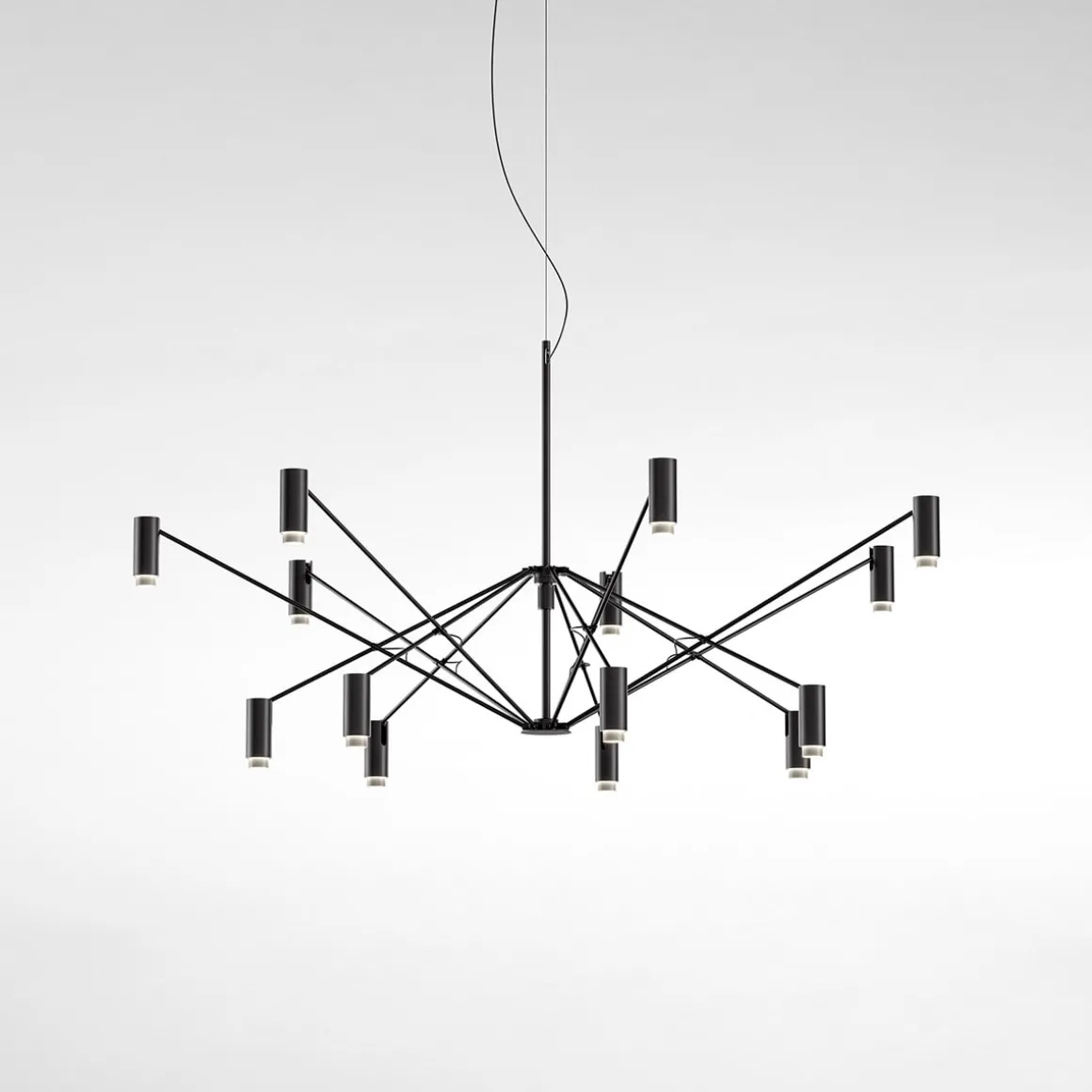 Die gleichmäßige, nach unten gerichtete verdankt sich den zylindrischen Strahlern, die an den Endpunkten der schwarzen Streben angeordnet sind und die LED- tragen. Als dekoratives Detail sind sie mit Innenringen in den Farben Gold, Elfenbein und Terrakotta versehen, die, wenn die Pendelleuchte eingeschaltet ist, das Licht reflektieren.