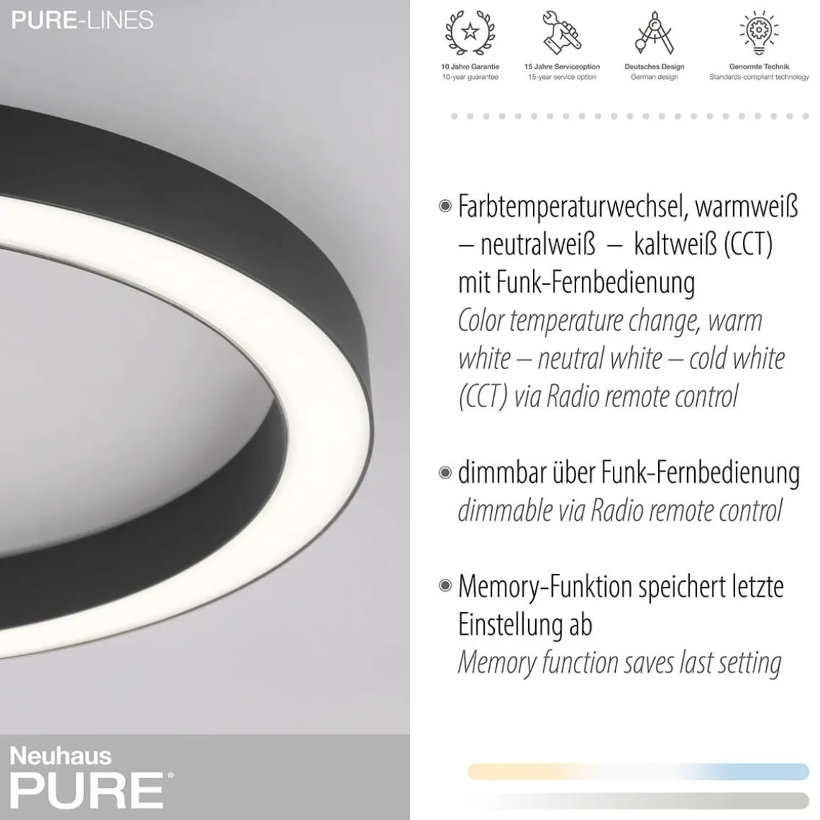 Die Pure Lines LED Deckenleuchte besticht durch ihr puristisches Design und ihre hochwertige Verarbeitung. Hergestellt aus erstklassigen Materialien und präzise gefertigt, steht diese für Qualität und Langlebigkeit – garantiert durch die 10 Jahre Paul Neuhaus Garantie. Beleuchten Sie Ihr Zuhause stilvoll und flexibel mit der PURE Lines LED Deckenleuchte.