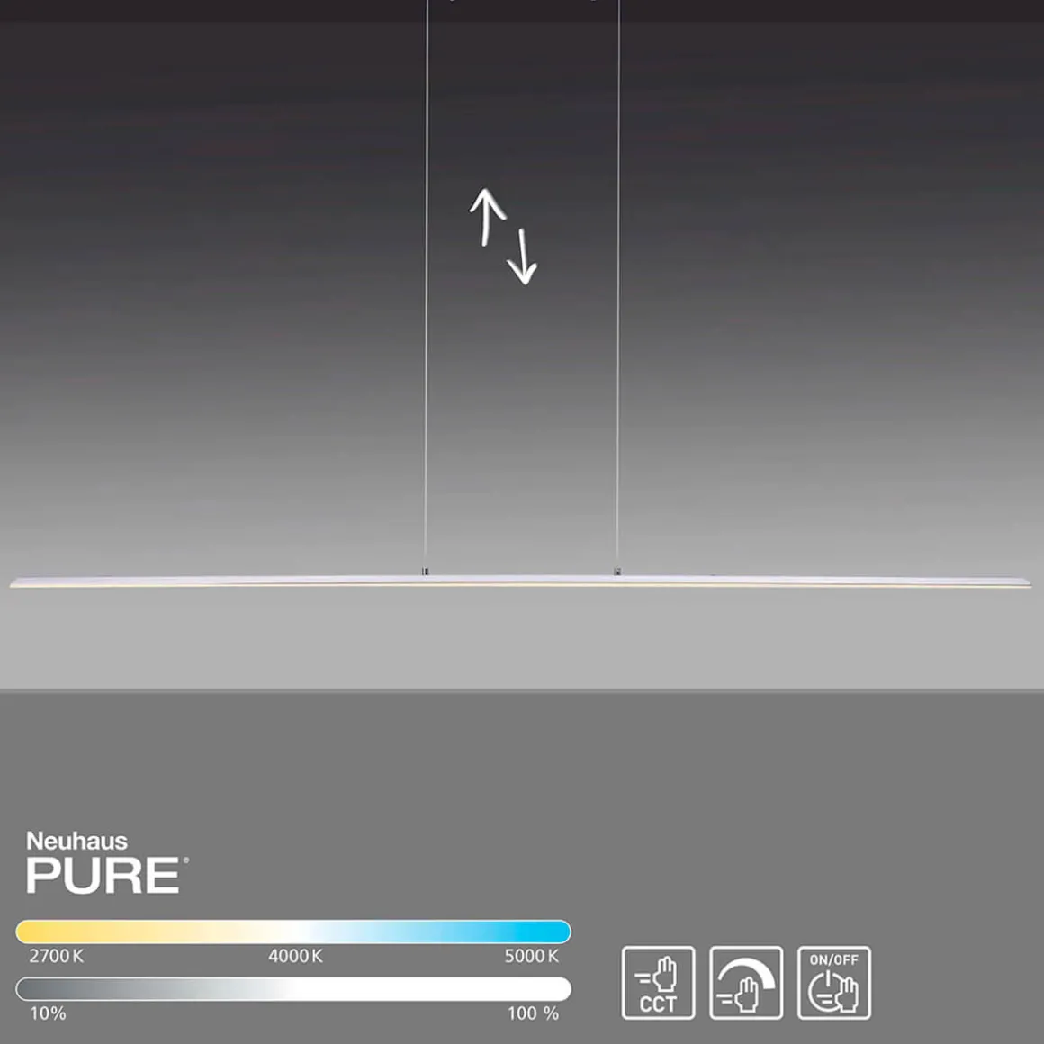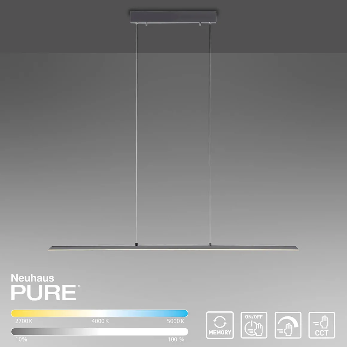 Die Memoryfunktion speichert Ihre Einstellungen für das nächste Einschalten. Diese LED-Pendelleuchte im puristischen Design ist Teil der Neuhaus PURE Leuchten, die mit ihrer ästhetischen und raffinierten Optik überzeugen.
