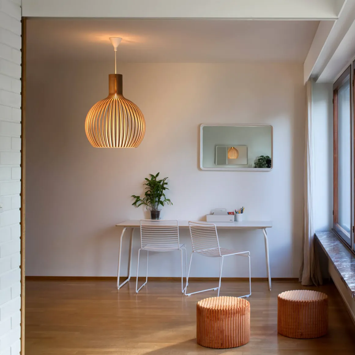Verfübar in Naturbirke, Weiß bzw. Schwarz laminiert und edlem Walnussfurnier, verströmt die ihr Licht direkt nach unten und lässt es sanft zwischen den zarten Lamellen hindurchfließen. Dies schafft eine atmosphärische Beleuchtung, die perfekt ist, um bestimmte Bereiche wie Tischflächen hervorzuheben, aber auch frei im Raum eine beeindruckende Wirkung entfaltet. Ob im heimischen Wohnzimmer oder in öffentlichen Räumen wie Restaurants, Cafés und Lobbys – die Octo 4240 sorgt überall für eine warme und einladende Atmosphäre.