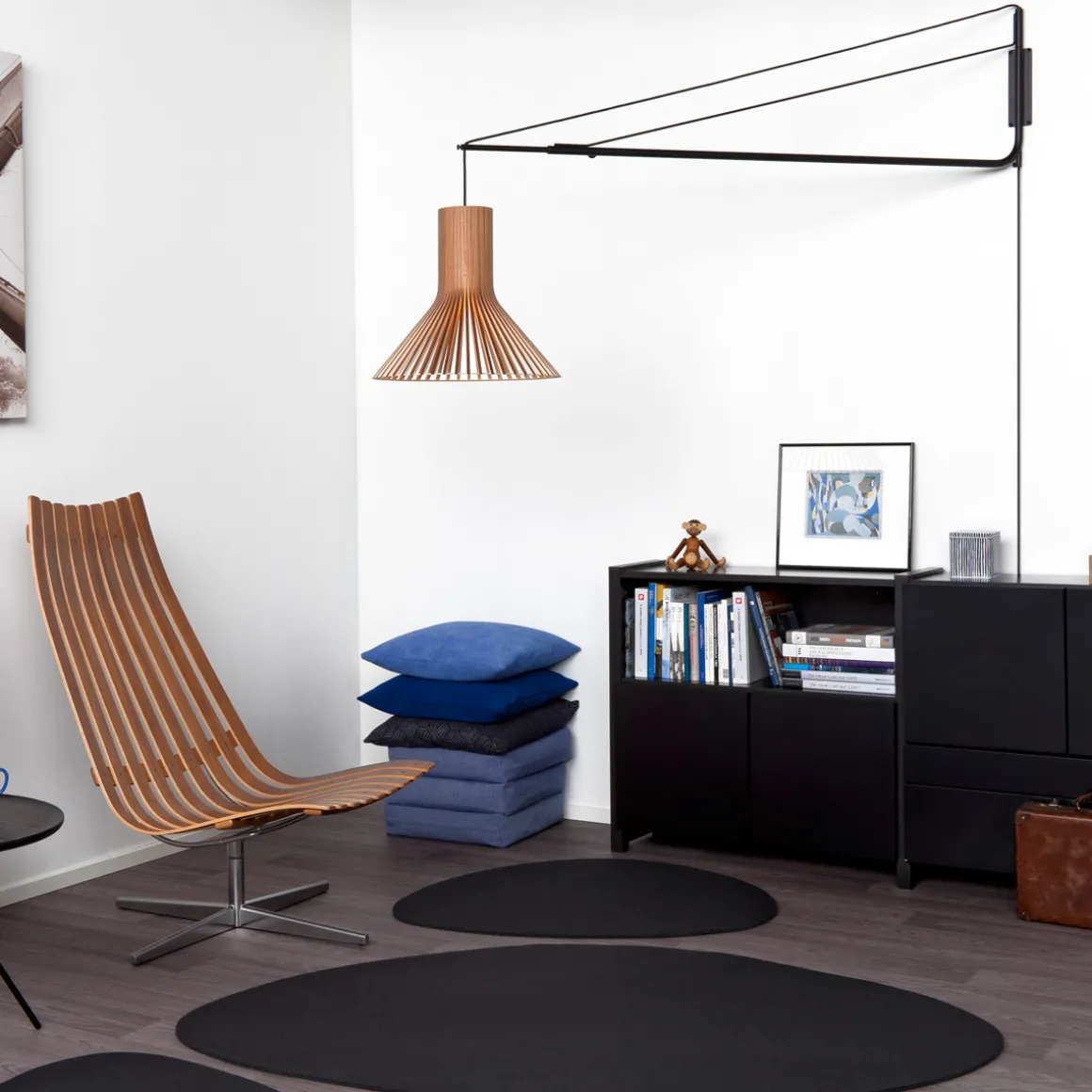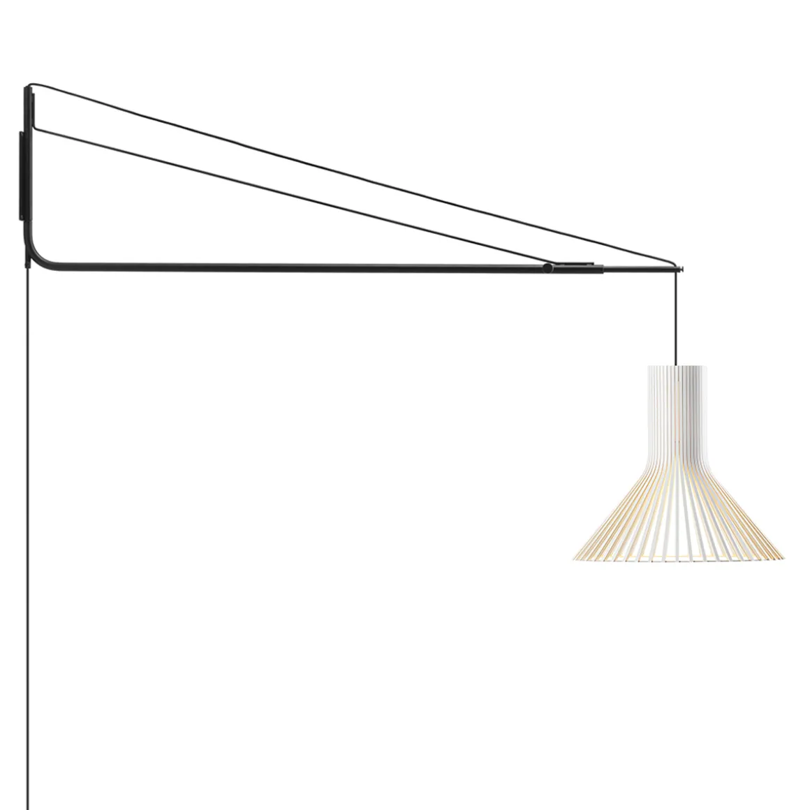 Die Wandhalterung der Varsi 1000 wird mittels vier Schrauben an der Wand befestigt (Schrauben nicht inbegriffen). Bitte beachten Sie bei der Auswahl der Schrauben Aspekte wie Hebelwirkung sowie Material und Stärke der Raumwände. Die gewünschte Pendelhöhe des Puncto 4203 Schirms kann über zwei Schrauben am Wandarm justiert werden.