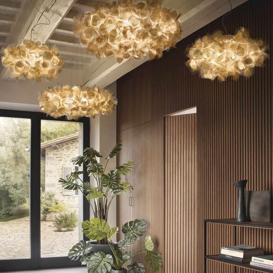 Eine luxuriöse Note suggeriert vor allem die goldene Version, die durch das Auftragen einer doppelseitigen Folie auf die Kunststoffblätter entsteht. Diese besondere Behandlung verleiht der Oberfläche eine reizvolle Craquelé-Struktur, die nicht nur die Widerstandsfähigkeit erhöht, sondern auch für faszinierende Lichteffekte sorgt. Die zarten Schattenspiele, die durch die Oberfläche erzeugt werden, schaffen eine einzigartige Atmosphäre und verleihen dem Design eine zusätzliche Dimension.