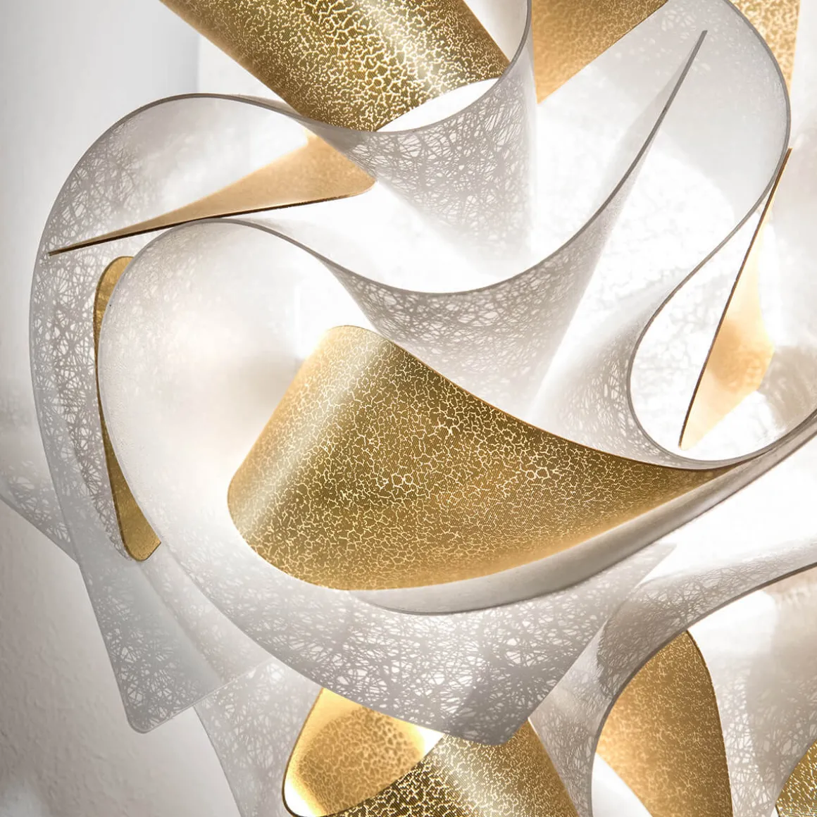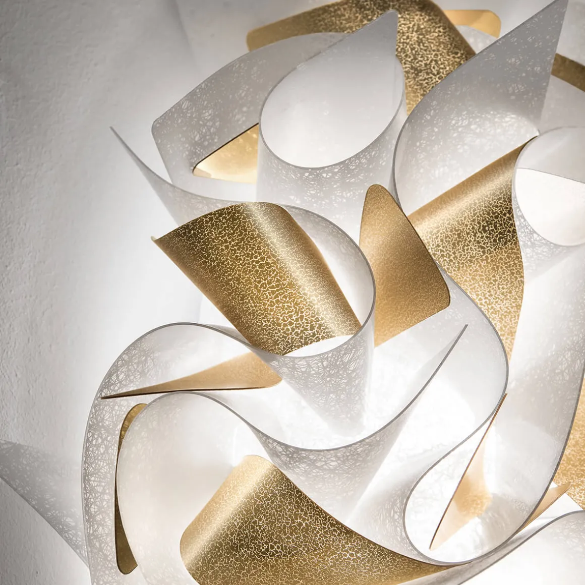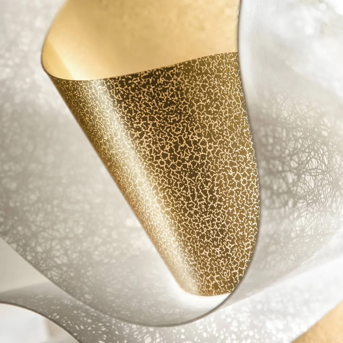 Wie ihre Vorgängermodelle begeistert die Veli Aurea Ceiling / Wall mit ihrer dynamischen Linienführung und fließenden Form. Zu einem unverwechselbaren Meisterwerk wird sie durch die eleganten Bänder aus Lentiflex®, die mit glanzvoller Goldfolie überzogen sind und einen reizvollen Craquelee-Effekt aufweisen. Sie bilden einen reizvollen Kontrast zur weißen Textur des seidig schimmernden Schirms aus Opalflex® und verleihen ihm eine raffinierte, opulente Ästhetik.