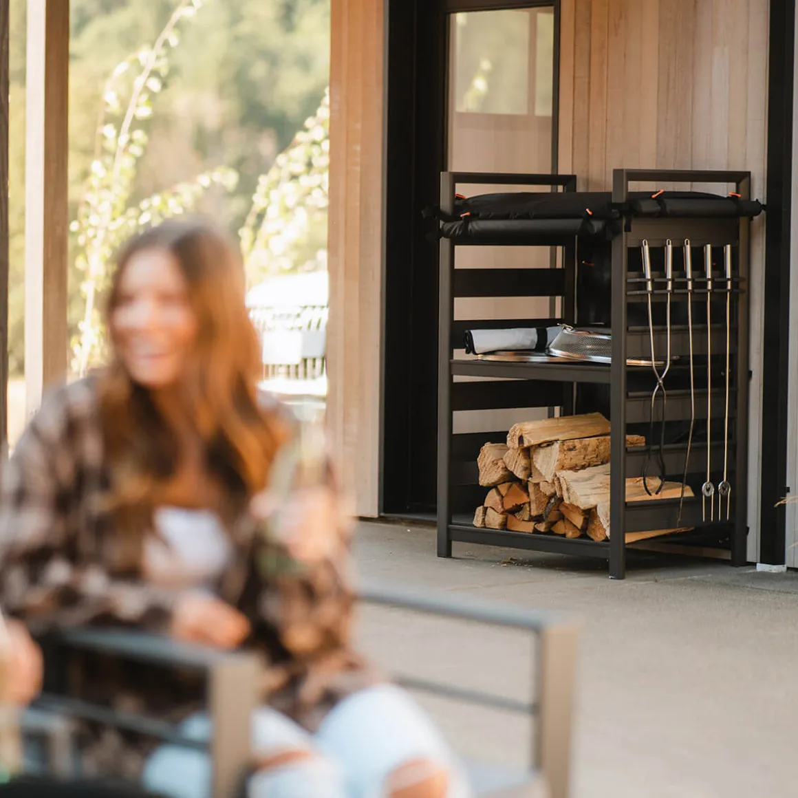 Robust und wetterfest konzipiert, schützt der Unterstand Ihre Feuerstelle zuverlässig vor Witterungseinflüssen wie Regen, Schnee und Eis. Die UV-beständige Abdeckung gewährleistet langanhaltenden Schutz und erlaubt zugleich eine ausreichende Belüftung für gelagertes Brennholz. Der Unterstand ist mit zwei praktischen Einlegeböden ausgestattet, die Platz bieten für zwei Reihen von Holzscheiten bis zu einer Breite von 25 bis 30 cm. Ihre Grillspieße und Feuerschalenwerkzeuge lassen sich an der seitlichen Aufhängung anbringen.