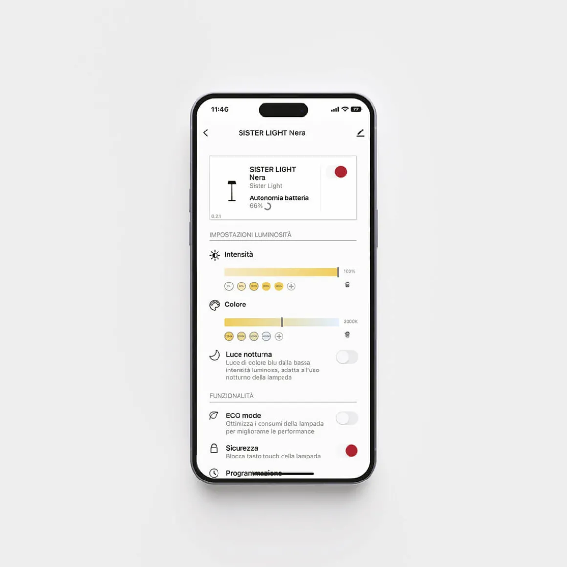 Über die kostenlose Zafferano Lighting App lässt sich die Sister Light Wi-Fi bequem via Smartphone steuern. Die Außenlampe bietet nicht nur einen 4-Stufen-Touchdimmer und einen 4-stufigen Lichtfarbwechsel, sondern auch eine smarte Kontrolle über die verbleibende Akkulaufzeit und gewährleistet einen konstanten , bis der Akku erschöpft ist. Mit ihrer -Zertifizierung und Salzwassersprühresistenz (1.500 h) ist sie optimal für den Außeneinsatz gerüstet.