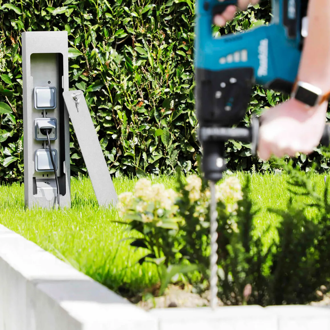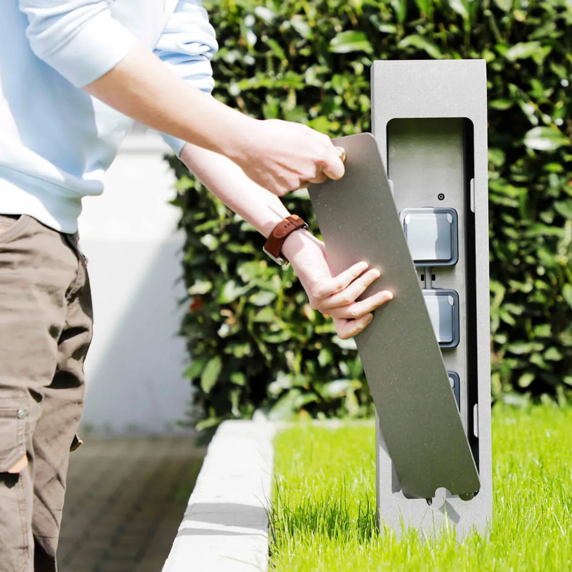 - Modern-schlichte Steckdosensäule mit abschließbarer Tür