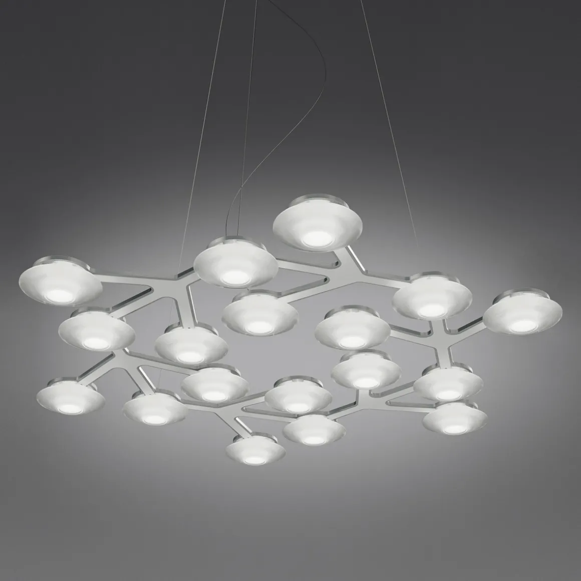 Mit der LED Net Circle Sospensione hat das Designerduo Michele De Lucchi und Alberto Nason eine kunstvolle, lichttechnisch moderne Pendelleuchte kreiert. Der Leuchtenkorpus besteht aus einer Vielzahl sich verzweigender Arme aus weiß lackiertem Aluminium, die – in kreisförmiger Anordnung – ein sich verästelndes Netz von Lichtquellen bilden.