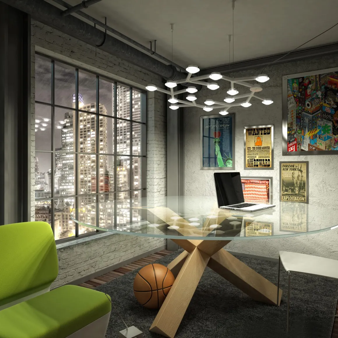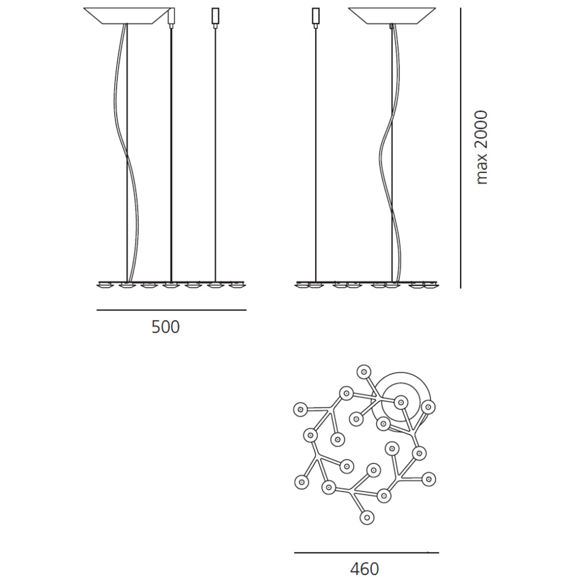 Die LEDs sind den Elementen an ihren jeweiligen Endpunkten eingesetzt und werden je von einer transparenten Kunststofflinse und einem Linsenträger aus mattem Methacrylat geschützt. Als Deckenhalterung dient eine Rosette in diskretem Weiß.