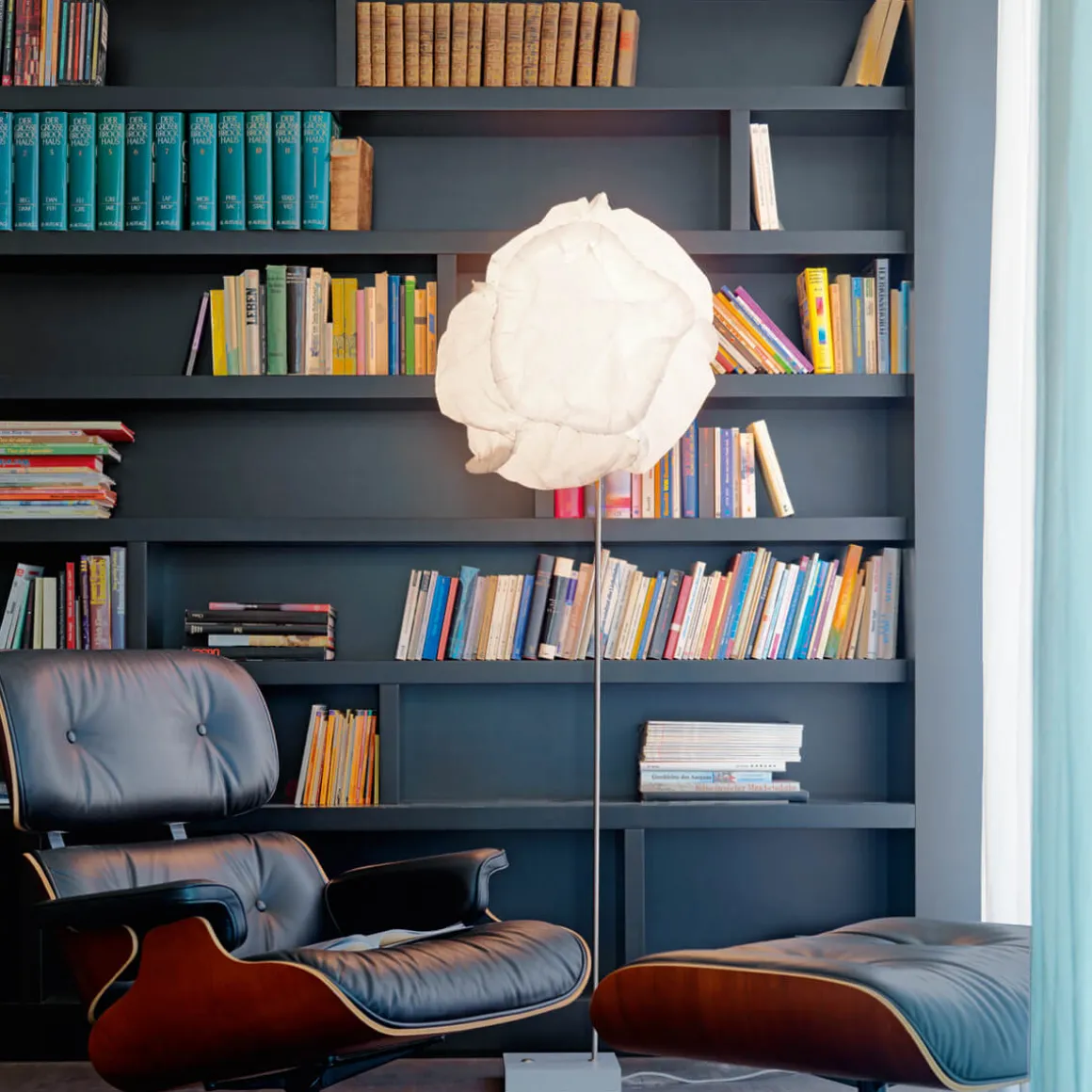 Gefertigt aus strapazierfähigen, leichten Materialien, überzeugt die Stehlampe durch ihre hochwertige Verarbeitung. Ihr voluminöser Schirm erinnert an einen weichen Schneeball und erhält durch Falten und Knicke eine organische Struktur. Jede ist ein Unikat, da der Schirm aus mehreren zusammengesteckten Schalenelementen besteht, deren Form sich individuell anpassen lässt. Durch sanftes Ausbeulen oder Eindrücken können Nutzer die Optik jederzeit verändern. Der schlanke Aluminiumfuß sorgt für Stabilität und fügt sich harmonisch in das Gesamtdesign ein.