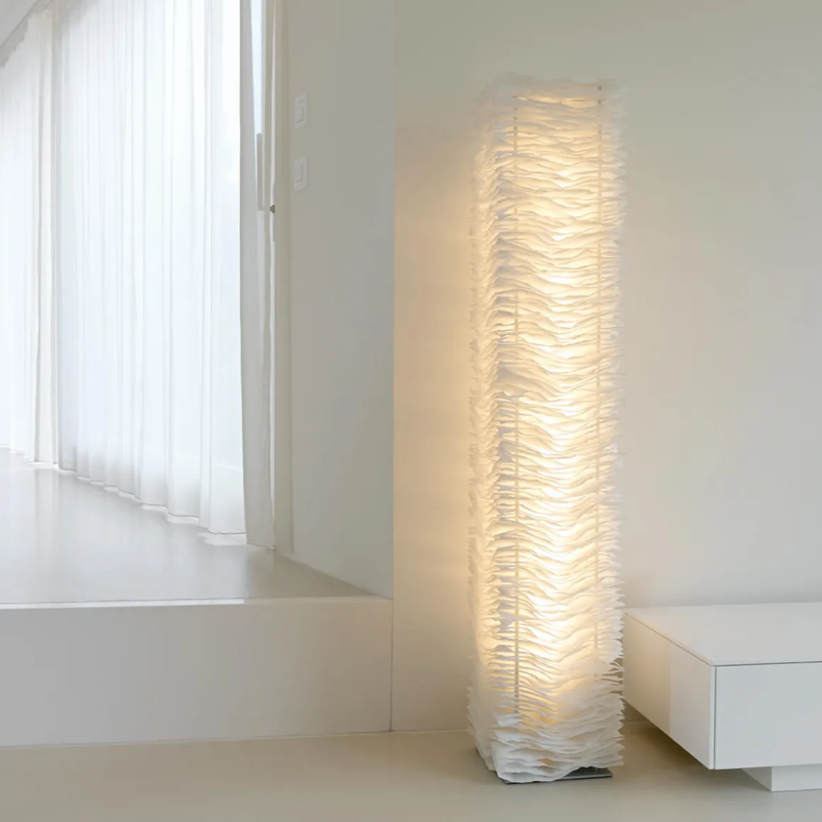 Die One By One Stehleuchte von Belux, entworfen von Steve Lechot, ist weit mehr als eine Lichtquelle – sie ist ein kunstvolles Designobjekt mit skulpturaler Eleganz. Die übereinandergelegten Schichten aus Polyestervlies erzeugen ein einzigartiges Licht- und Schattenspiel, das jedem Raum eine atmosphärische Tiefe verleiht. Durch eine spezielle Veredelung ist das Material reißfest, alterungsbeständig und schwer entflammbar, was die besonders langlebig und pflegeleicht macht.