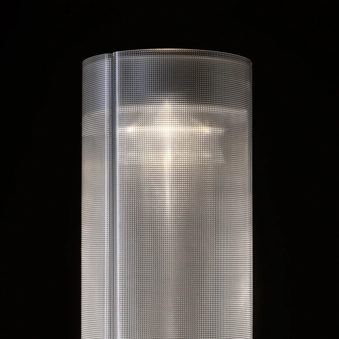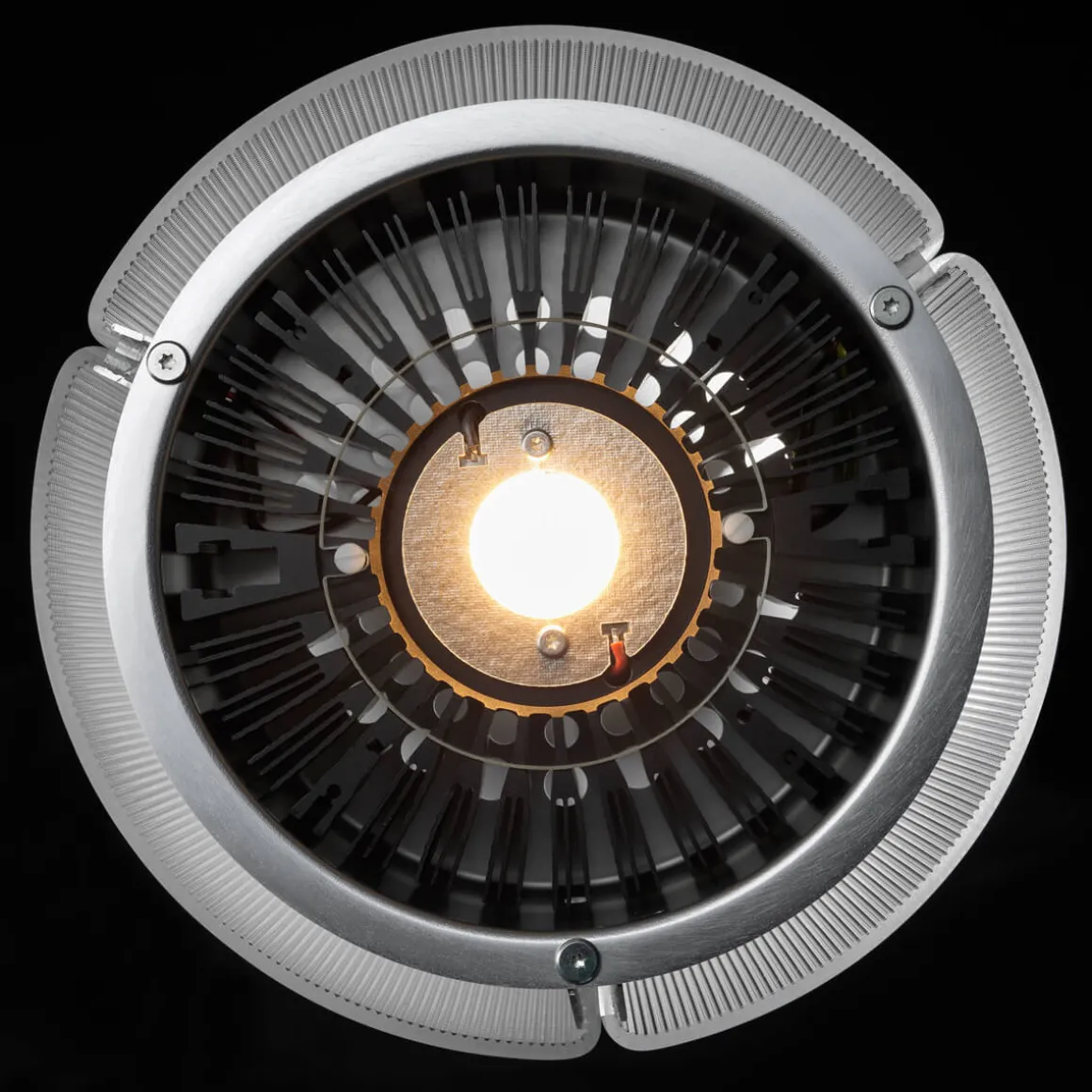 Die Twilight 360 beeindruckt nicht nur durch ihr raffiniertes Lichtkonzept, sondern auch durch ihre hochwertige Verarbeitung. Der Sockel ist in edlem Aluminium oder eloxiertem Dark Bronze gehalten und verleiht der eine elegante Note. Besonders markant wirkt die schwarze Version, bei der der lackierte Sockel von einem schwarz eingefärbten Schirm ergänzt wird. Der Leuchtschirm aus Acrylglas mit gebogener Prismenstruktur sorgt für eine einzigartige Lichtbrechung, die sich je nach Betrachtungswinkel ändert und so ein faszinierendes Lichterlebnis schafft.
