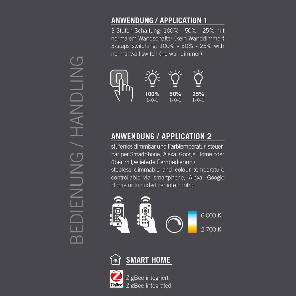 Zusätzlich zur stufenlosen Dimmfunktion lässt sich die Athos LED in ihrer Lichtfarbe variieren: von warmweißen, gemütlichen 2.700 Kelvin bis hin zu tageslichtähnlichen, kaltweißen 6.000 Kelvin. Hierdurch eignet sich die besonders für den Einsatz in Wohnräumen, Schlafzimmern und Fluren, wo eine funktionale und flexible Beleuchtung gefragt ist. Eine Montage durch Fachpersonal wird empfohlen, um die volle Funktionsfähigkeit des ZigBee-Moduls zu gewährleisten.