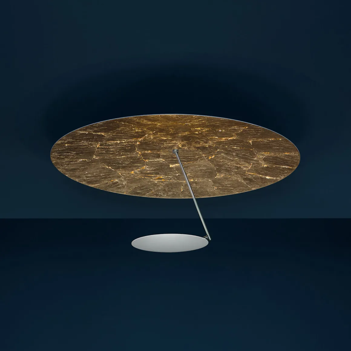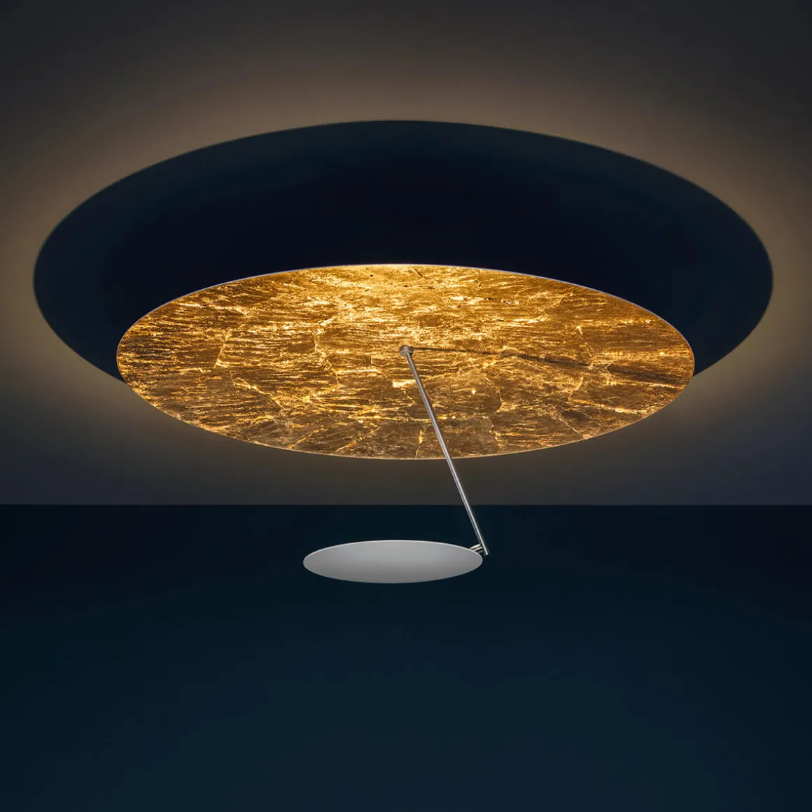 | Material/Oberfläche: | Aluminium, Goldfolie, Reflektorscheibe: weiß, Stange: Metall satiniert, Baldachin: weiß |