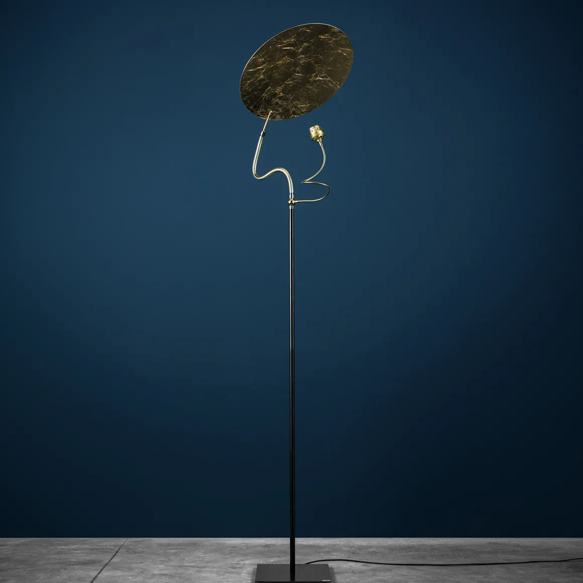 | Material/Oberfläche: | Aluminium mit Blattmetallauflage, Sockel: Roheisen, Flexarm: Nickel / Messing, Kabel: schwarz |