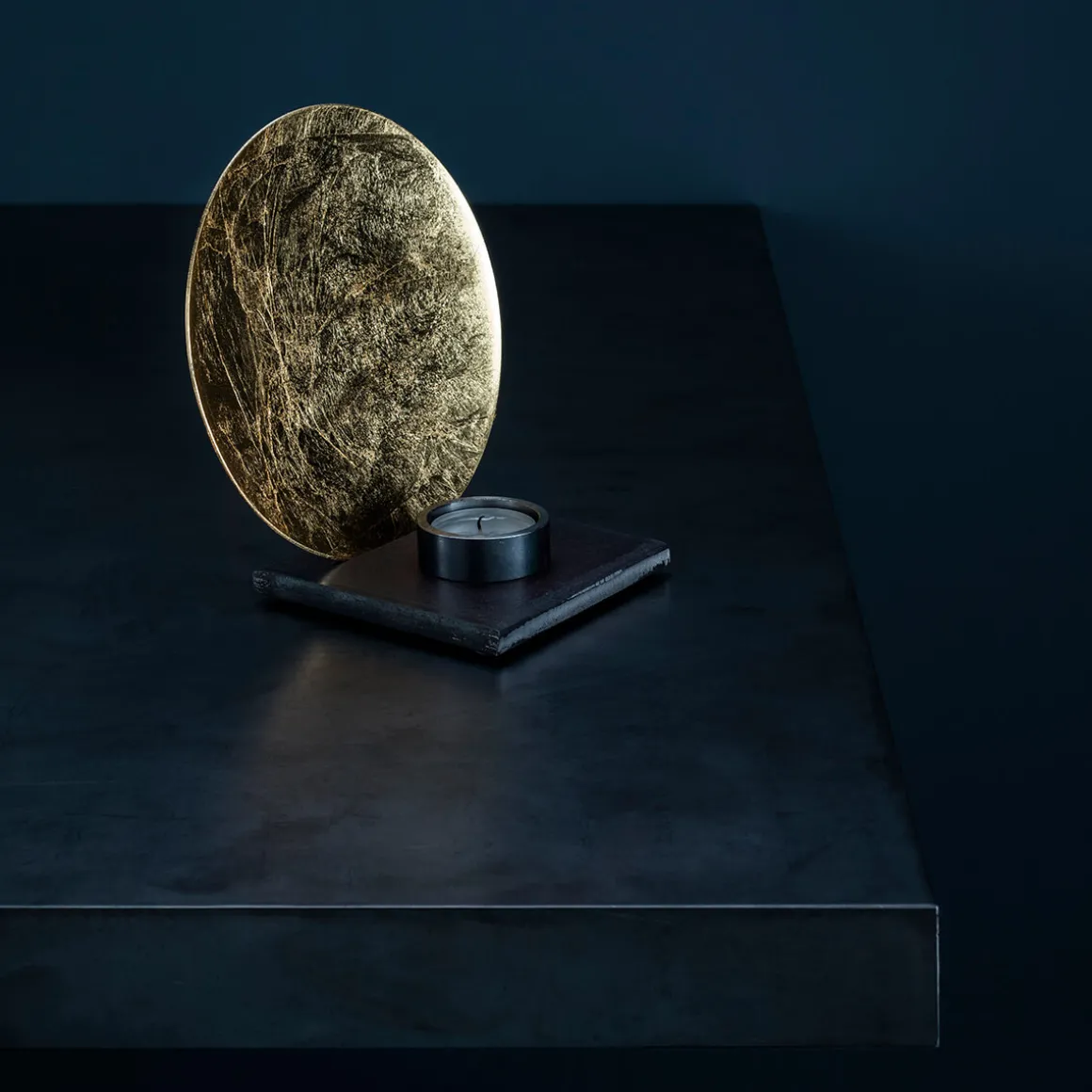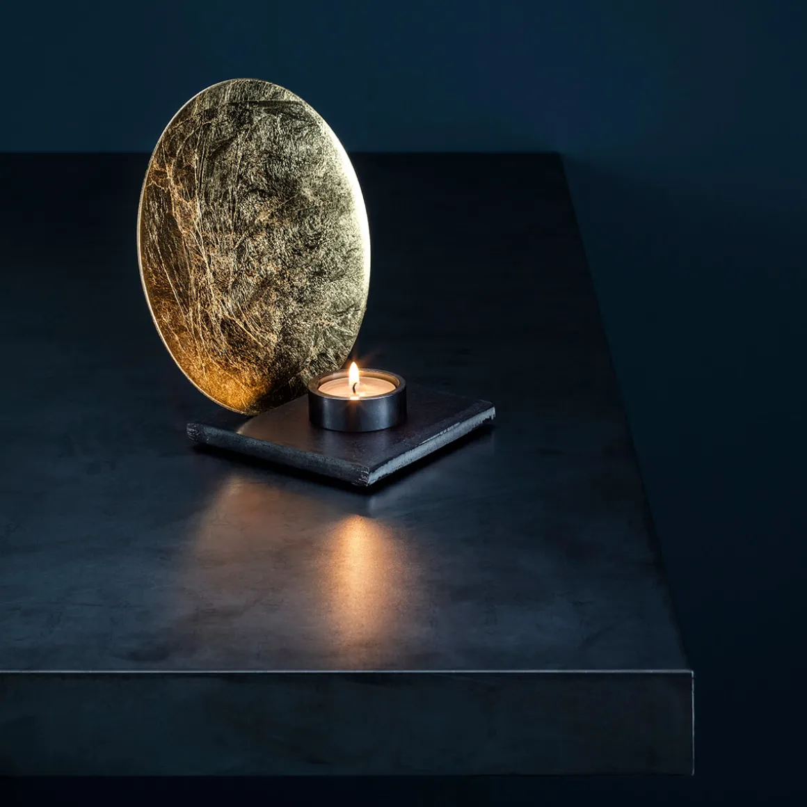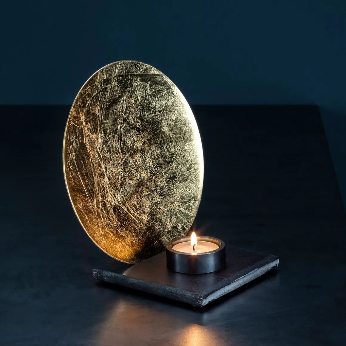 Mit seiner schlichten runden Silhouette, dem Sockel aus rohem Eisen und dem fein gearbeiteten Reflektor in Blattgold, Blattsilber oder Blattkupfer erzeugt der Teelicht-Halter faszinierende Lichtreflexe und schafft eine warme, meditative Atmosphäre – ob auf dem Esstisch, dem Sideboard, der Fensterbank oder der Kommode.