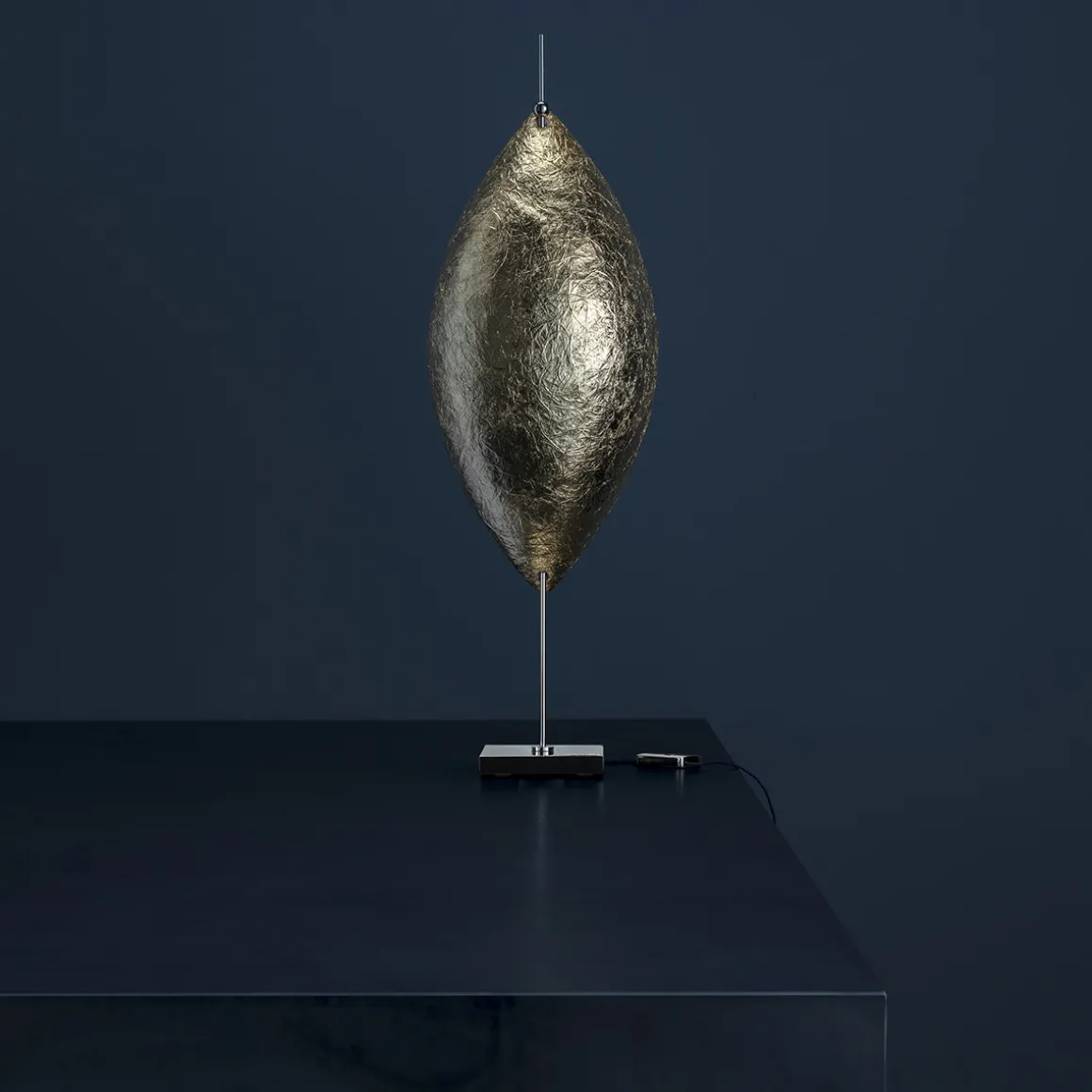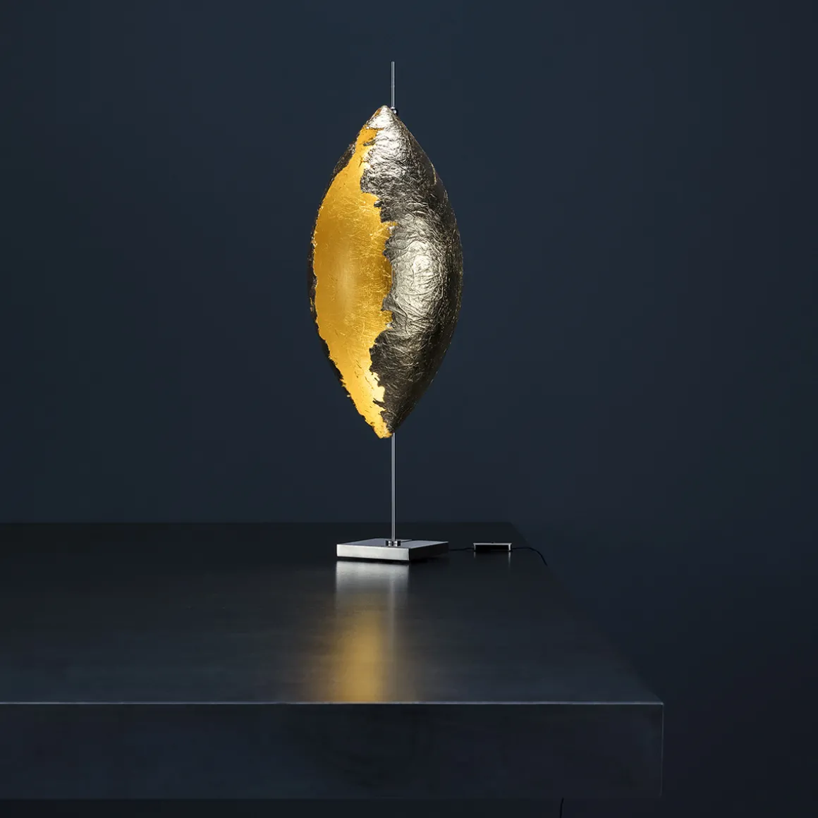 | Material/Oberfläche: | Fuß: Nickel und vernickeltes Kupfer, Fiberglas weiß lackiert / Blattgold / Blattsilber, Kabel: blau |