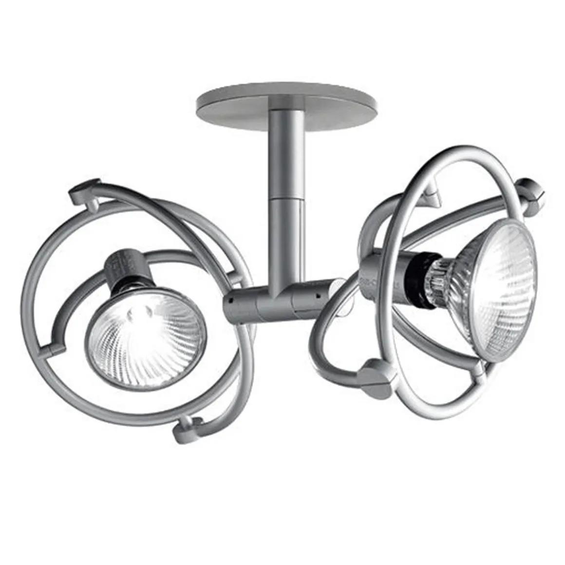 Modern, flexibel und den individuellen Gegebenheiten angleichbar – das ist die zweiflammige Cini & Nils Faridue Parete / Soffitto, eine Produktkreation der Designer Franco Bettonica und Mario Melocchi aus dem Jahre 1994. Mit ihrer funktionalen Gestaltung und der fokussierten Lichtausstrahlung eignet sich die Wand- und Deckenleuchte für den privaten und öffentlichen Raumbereich gleichmaßen, für das heimische Wohnzimmer ebenso wie für Geschäftsräume und Büros. Gefertigt ist die Faridue Parete / Soffitto aus silberfarben lackiertem Kunststoff. Ihre besondere Einsatzflexibilität verdankt sie den grazil gestalteten Strahlerköpfen, die sich ganz nach Belieben drehen und wenden lassen: An ihrem Sockel sind sie um bis zu 320° drehbar, die kreisrunden Halteringe lassen sich um 270° schwenken. Überdies können die die tragenden Haltebögen um bis zu 90° gekippt werden.