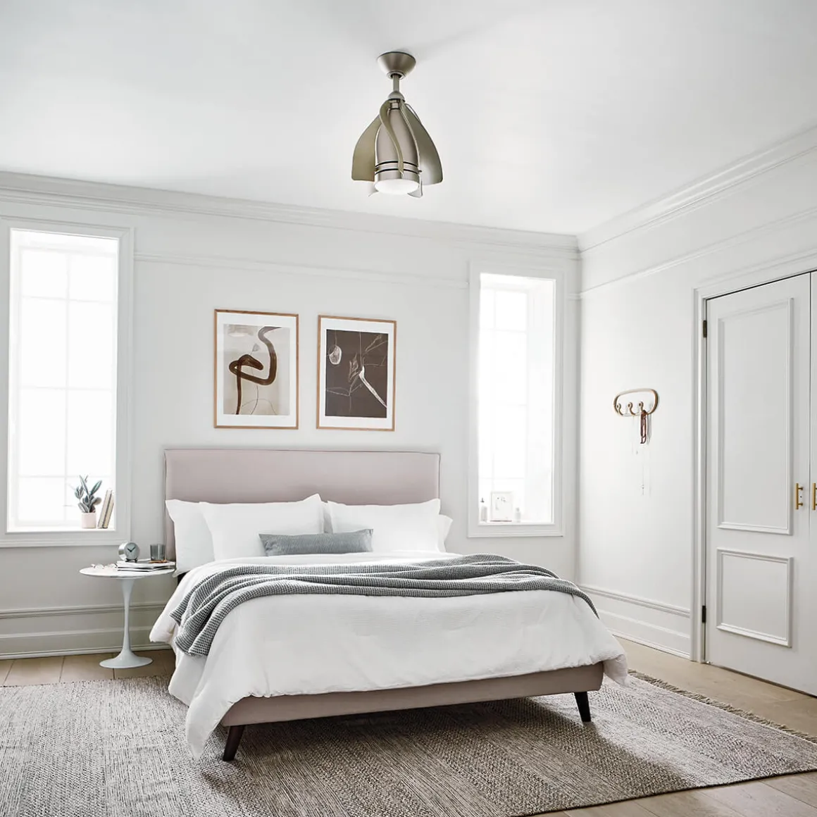 Der Terna Deckenventilator von Elstead Lighting erinnert an eine kleine Schiffsschraube und macht nicht nur in industriell angehauchten Einrichtungskonzepten eine gute Figur. Er ist die perfekte Unterstützung an heißen Sommertagen und sorgt im Schlaf- und Wohnbereich für frische Luft. Mit seinen schmalen Rotorblättern belüftet er eine Fläche von circa 8 m², womit er sich vor allem für kleinere Raumbereiche eignet.